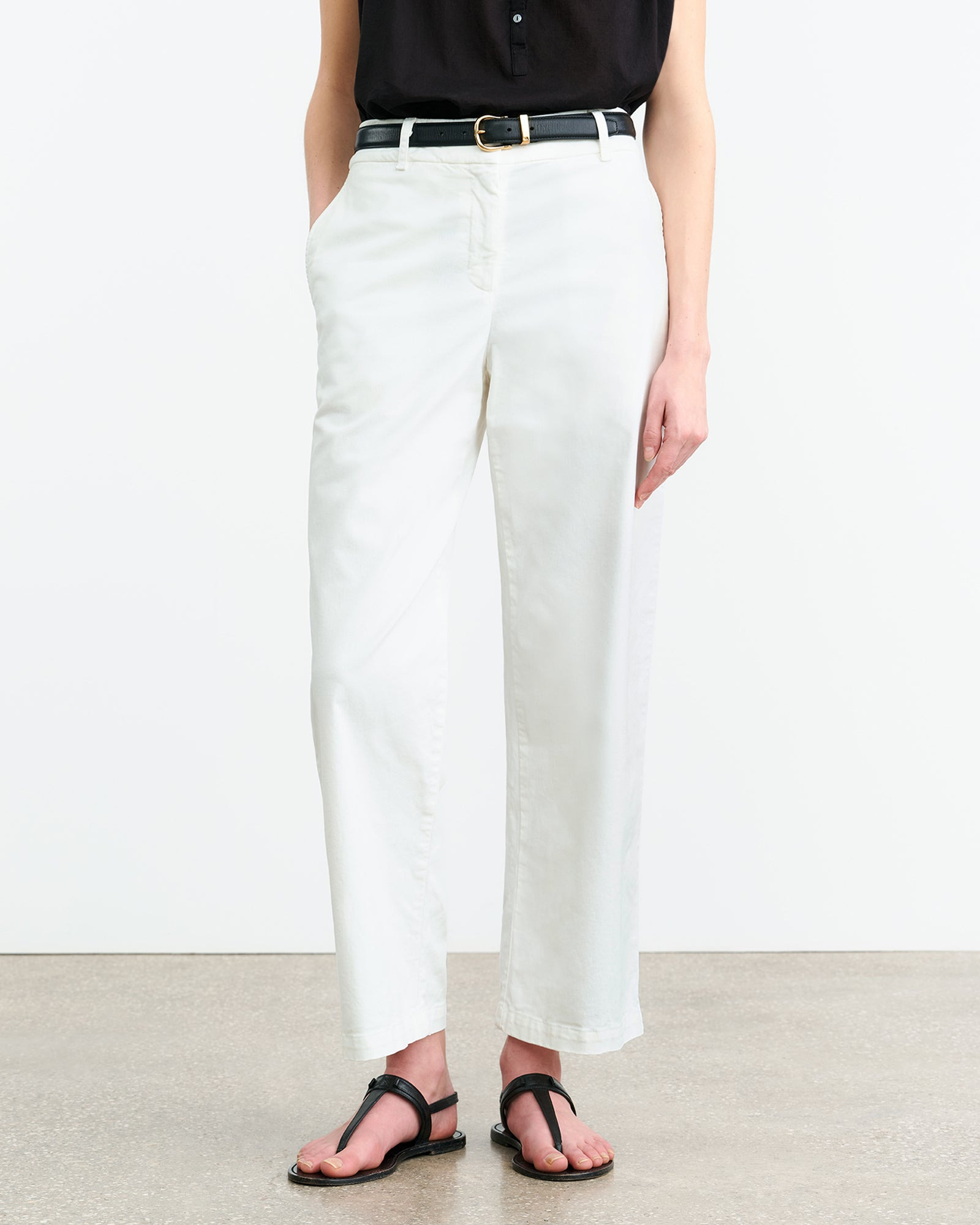 Mid-rise, straight leg cropped pant in Italian brushed stretch twill cotton. Curtain waistband. Slash pockets. Back darts.