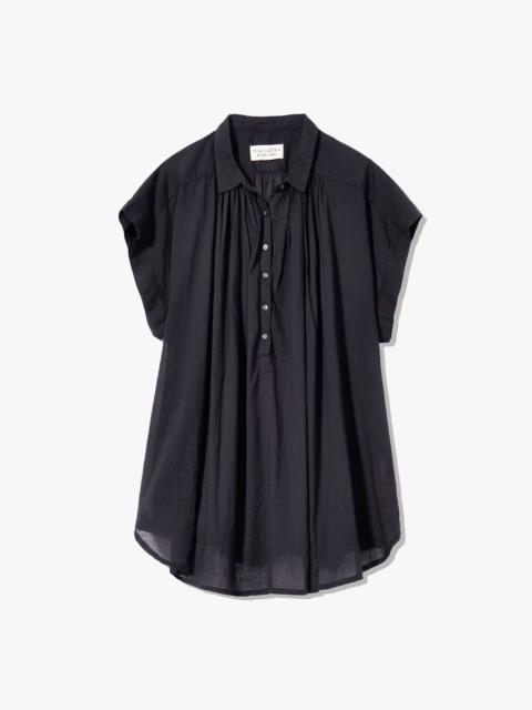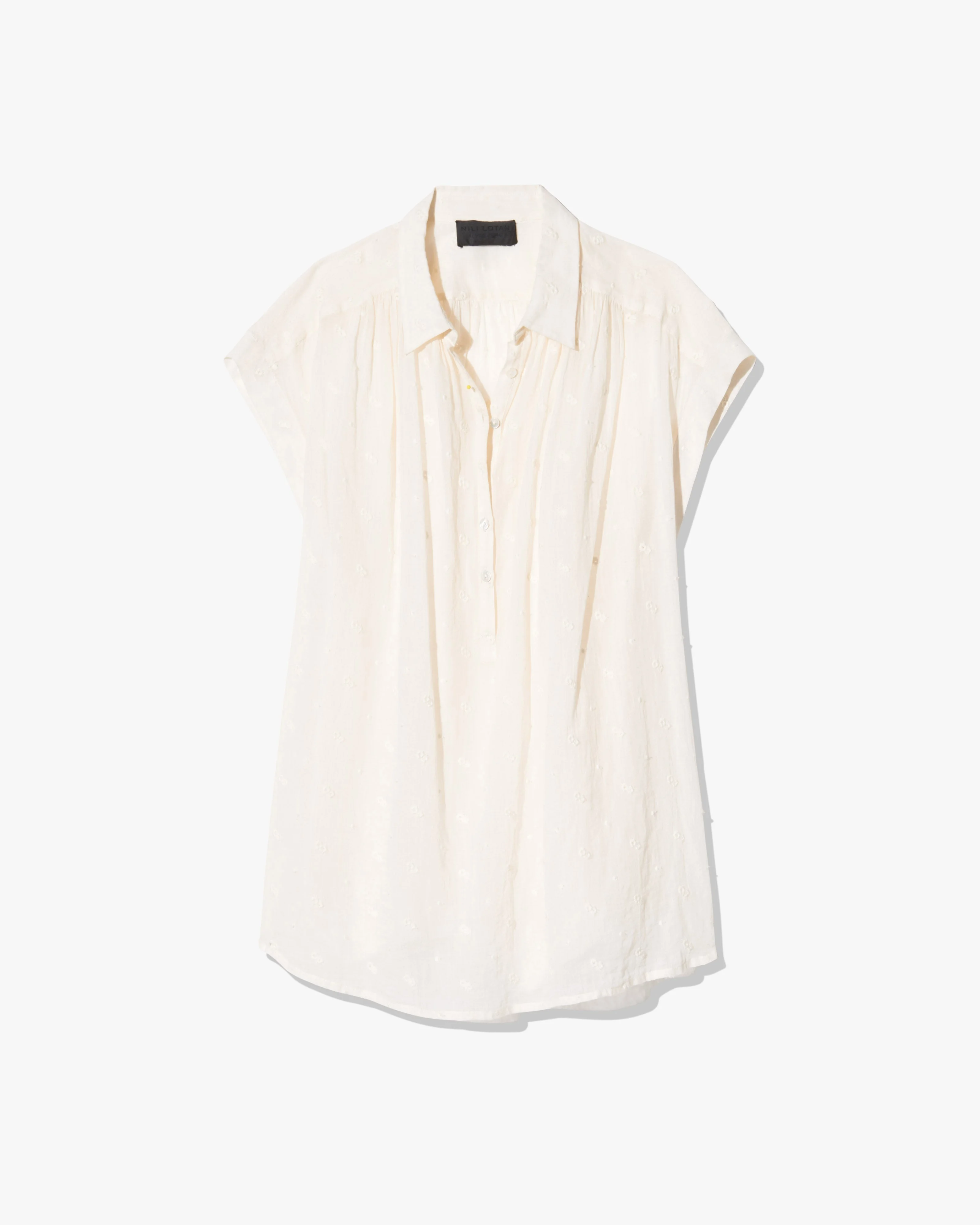 Oversized, voluminous pullover blouse. Dropped shoulder. Center front half button down with troka buttons. Shirring throughout front and back. Small collar. Shirttail hem. Hanger loop detail at back. Easily able to tuck in. COMPOSITION & CARE 100% Cotton Gentle wash cycle Tumble dry low Low iron Dry clean recommended