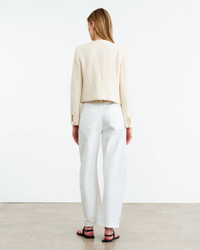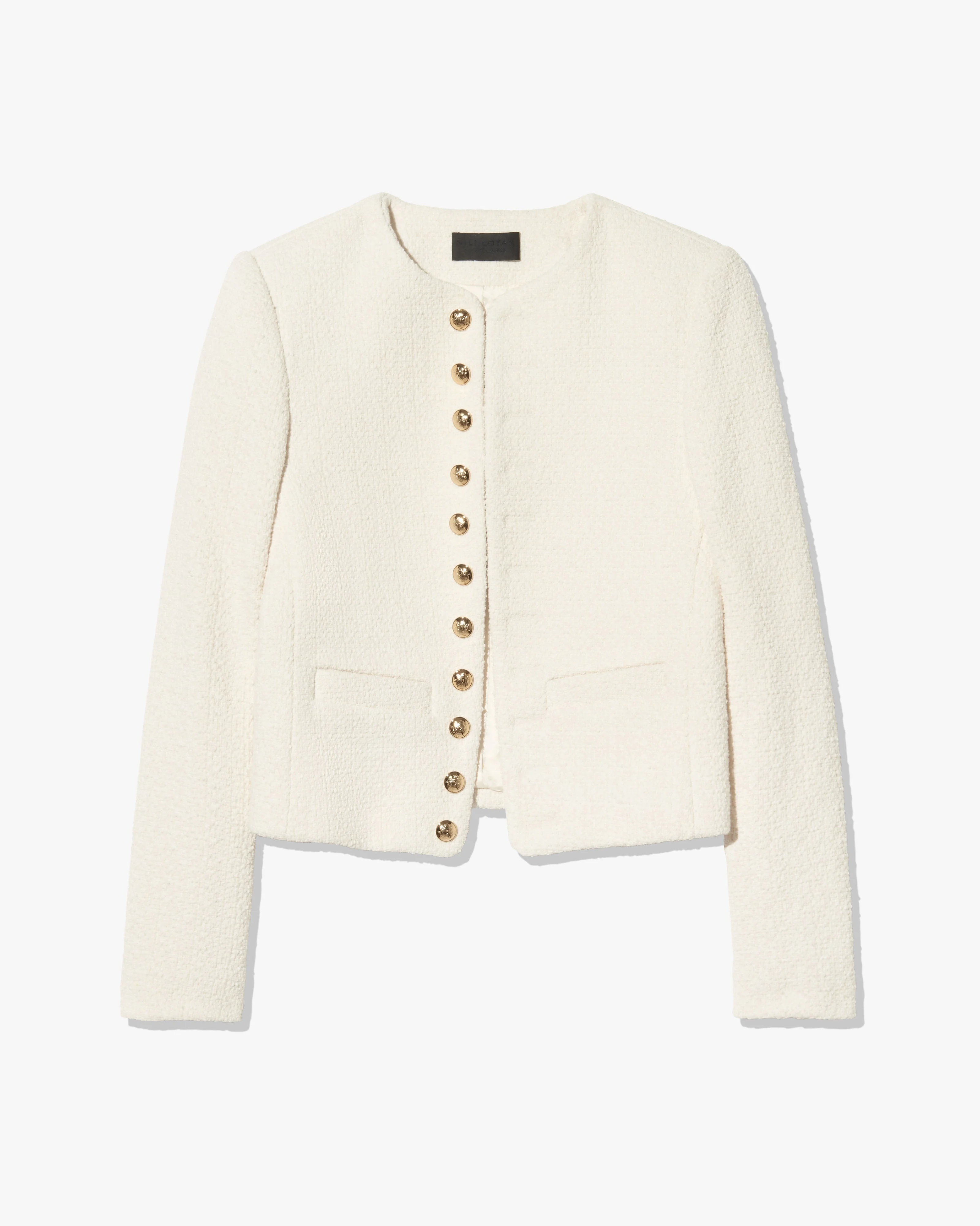 Slim cropped jacket in Italian cotton blend tweed boucle. Shoulder pads. Welt pockets. Decorative signature crest buttons in antique brass at front and cuff. Back seams. Fully lined. COMPOSITION & CARE 57% Cotton, 33% Polyamide, 8% Polyester, 2% Other Fiber Dry clean only Low iron