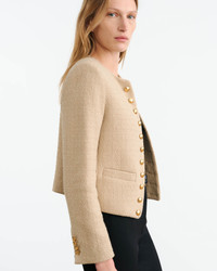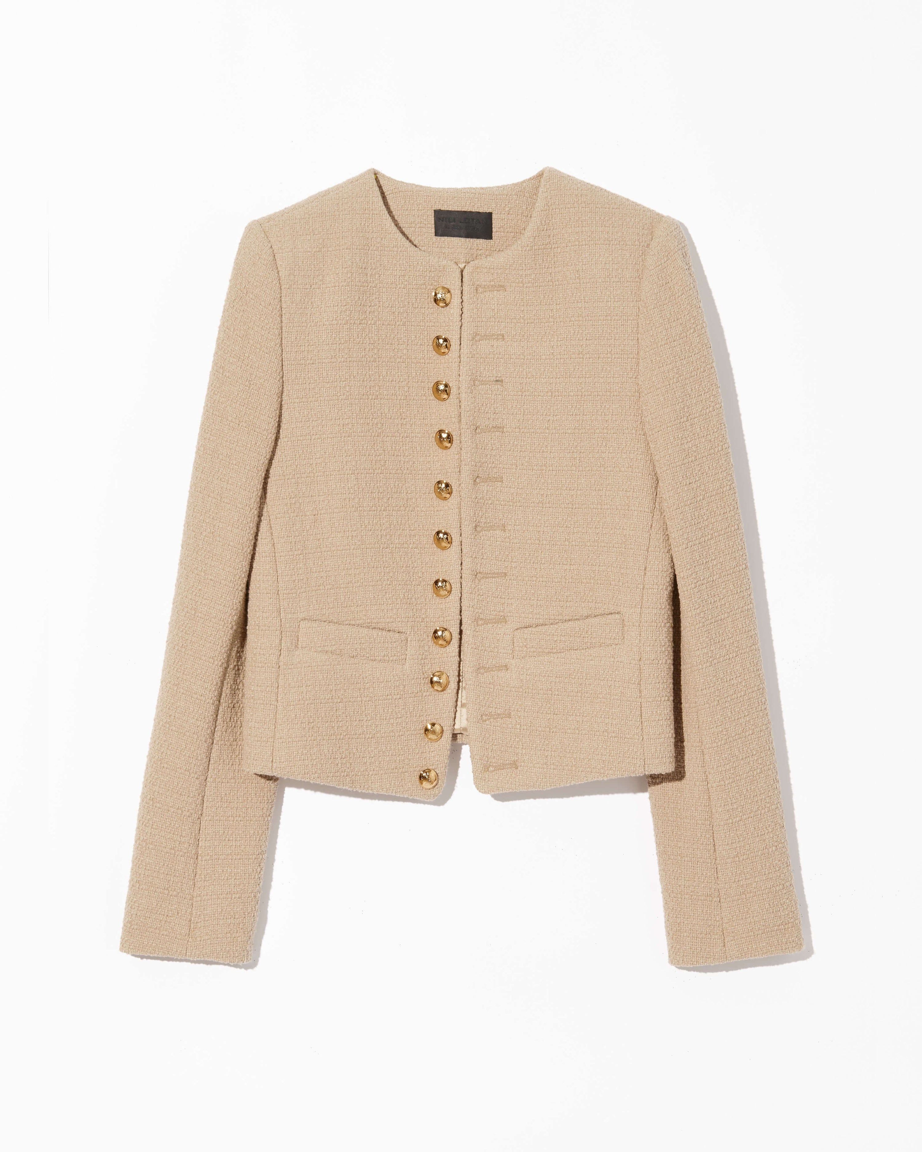 Slim cropped open jacket in Italian boucle. Shoulder pads. Welt pockets. Decorative signature crest buttons in antique brass at front and cuff. Non-functional buttonholes. Back seams. Fully lined. COMPOSITION & CARE 68%COTTON 32%POLYAMIDE Dry clean only Low iron