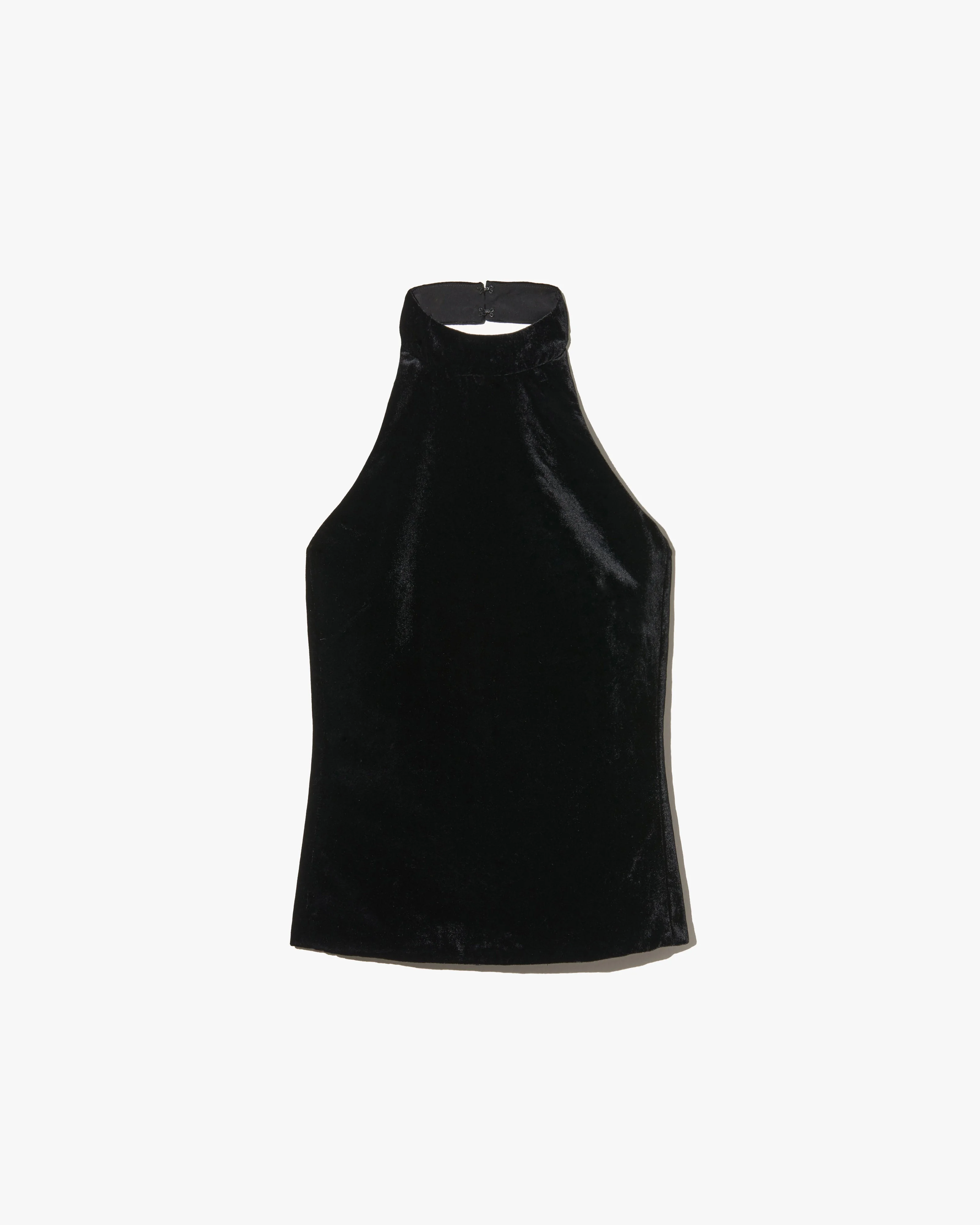 Slim fit halterneck top in fluid velvet. Lined in silk chiffon. High neck. Hook-and-eye closure at back. Zipper entry at back. Hits at the hip. - Made in USA - 75% Viscose 25% Nylon - Dry clean only - Low iron