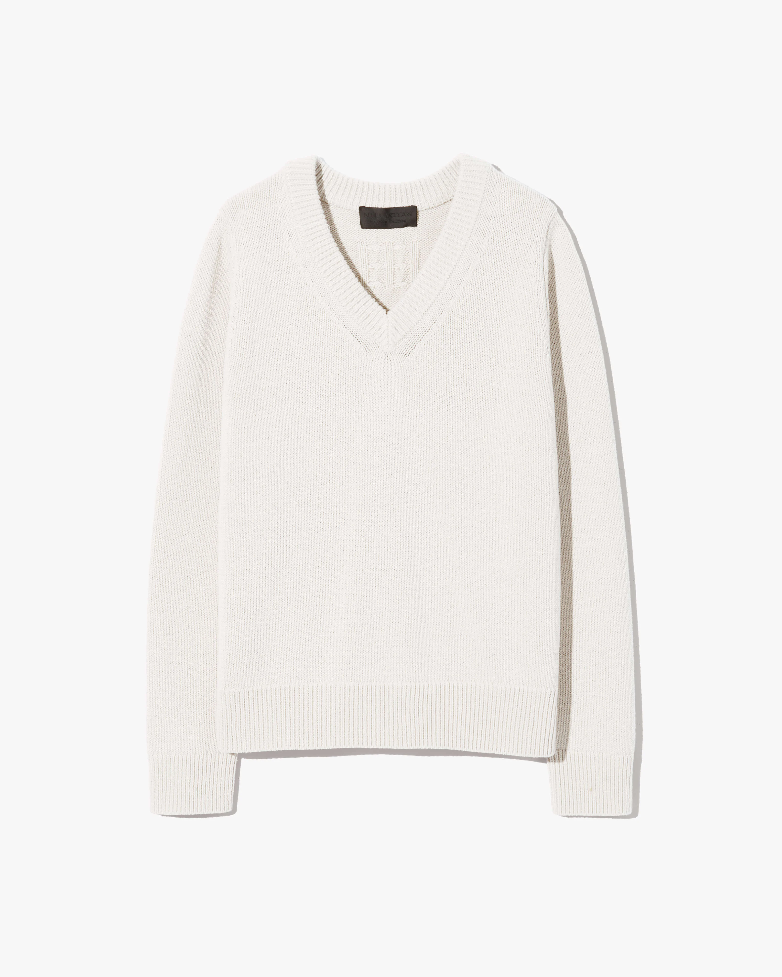 Light to medium weight boxy v-neck sweater in Italian cotton silk blend. Standard sleeve length. Double layer rib trim at neck, sleeves and hem. Fully fashioned at arm hole and shoulder. - 55% Cotton 45% Silk - Dry clean only