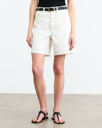 Low-rise relaxed leg jean short in Japanese non-stretch denim. Five pocket detail. Fly zip. Shank closure. Longer inseam. Raw hem. Natural fray. Belt loops. Made in USA COMPOSITION & CARE 100% Cotton Machine wash cold Tumble dry low Medium iron Do not bleach Do not dry clean