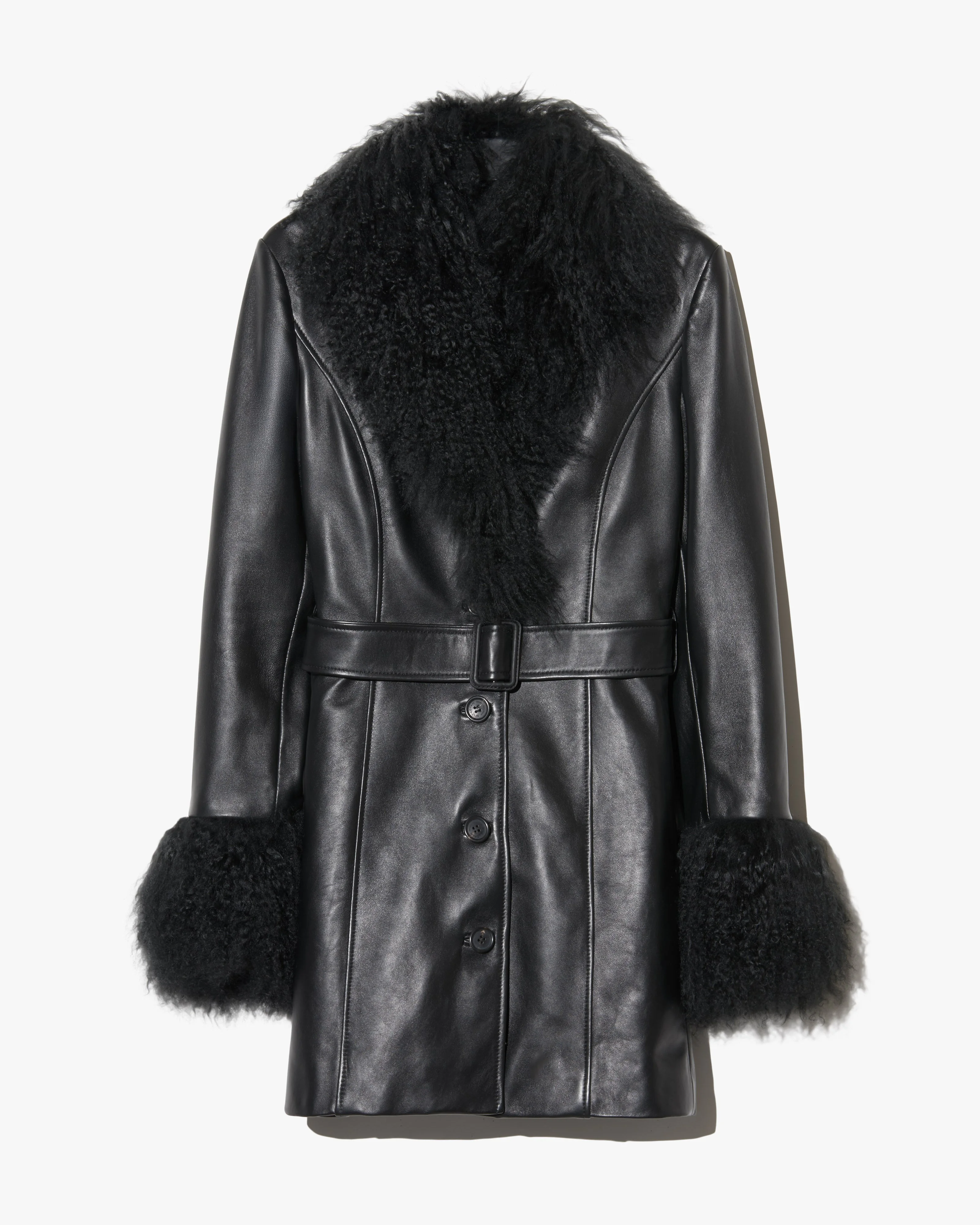 Slim leather jacket in a combo of Mongolian skin at cuffs and neck with matte Italian leather. Seaming and topstitching details. Belt loops with leather buckle. Side seam pockets. Center front logo horn buttons and center back seam. Fully lined with leather facing. - 100% Lambskin Leather - Spot clean only - Professional leather care only