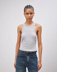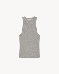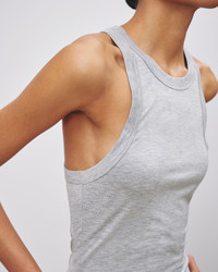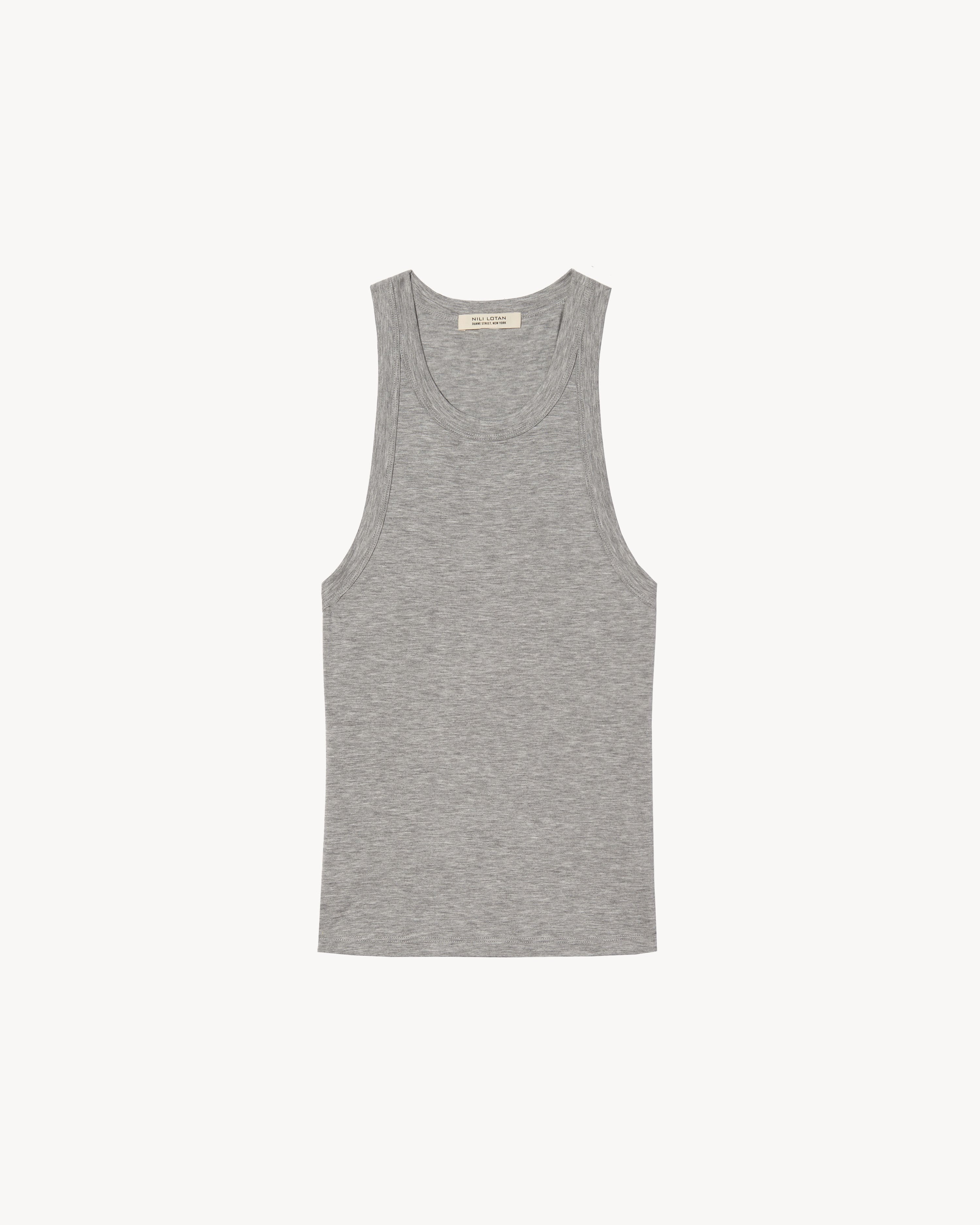Slim fit tank. Low arm hole. Back body almost racerback. Arm hole finished with self trim. Made in USA COMPOSITION & CARE 95%RAYON 5%LYCRA, MADE IN USA MACHINE WASH COLD TUMBLE DRY LOW LOW IRON