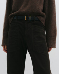 Mid-rise, relaxed fit barrel leg pant. Uniquely curved silhouette. Seam detail at knees. Gusset at inseam. Zip fly. Hidden hook-and-bar closure. Hidden stay button closure. Top-stitched front and back patch pockets. Belt loops. Designed for a 26.3" inseam. - Made in USA - 93% Cotton, 6% Polyester, 1% Polyurethane - Do not bleach - Machine wash cold - Tumble dry low - Low iron - Do not dry clean