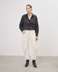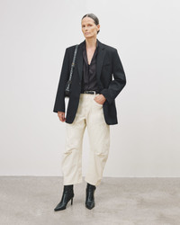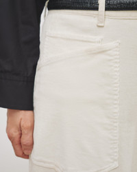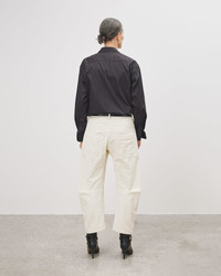 High-rise relaxed-fit pant in stretch corduroy. Uniquely curved silhouette. Easy gently tapered legs. Seam detail at knees. Zip fly and button front closure.Top-stitched front and back patch pockets. Note : The Shon is roomy. If you want it to sit higher on the waist, we recommend ordering a size down. Made in USA SIZE & FIT Model wears size 0. For exact measurements by size, view our size guide. COMPOSITION & CARE 93% COTTON, 6% POLYESTER, 1% POLYURETHANE DO NOT BLEACH MACHINE WASH COLD TUMBLE DRY LOW LOW IRON DO NOT DRY CLEAN