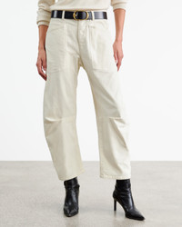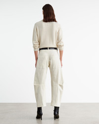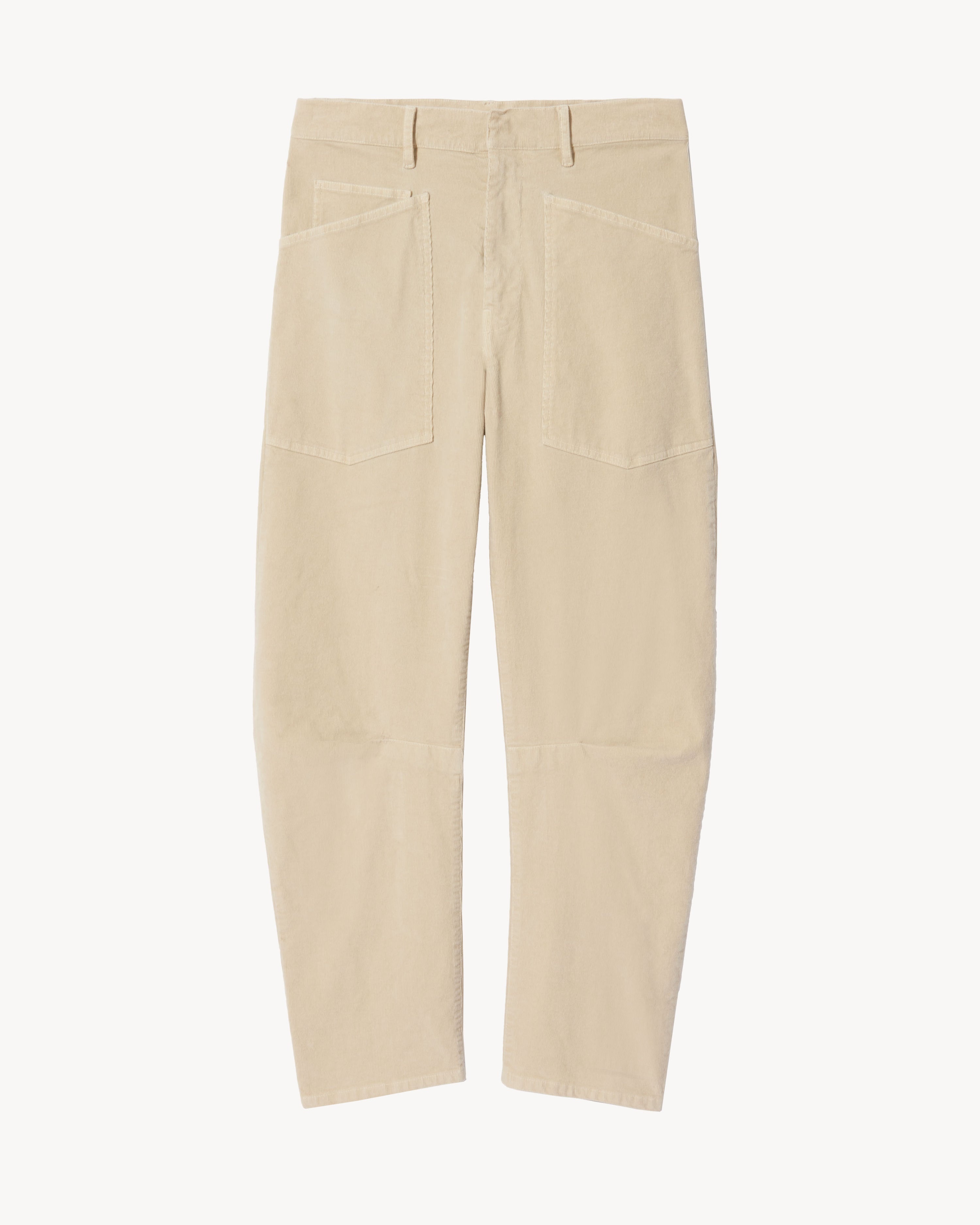 Flat front, mid-rise, relaxed fit pant in stretch corduroy. Uniquely curved silhouette. Easy gently tapered legs. Seam detail at knees. Zip fly with hidden hook and bar closure. Hidden button closure. Top-stitched front and back patch pockets. Belt loops. Made in USA COMPOSITION & CARE 93% COTTON, 6% POLYESTER, 1% POLYURETHANE DO NOT BLEACH MACHINE WASH COLD TUMBLE DRY LOW LOW IRON DO NOT DRY CLEAN