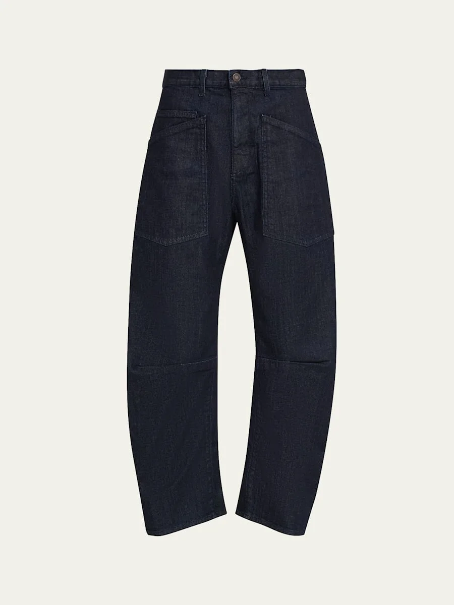 Nili Lotan "Shon" jeans with seam detail at knees Mid rise Five-pocket style Curved silhouette Cropped at the ankle Button/zip fly; belt loops Cotton/polyurethane Hand wash Made in USA Model is 5'10"/177cm. Online Inquiries: BGS21_B8VSE| Store Inquiries: #4665497