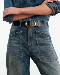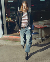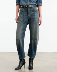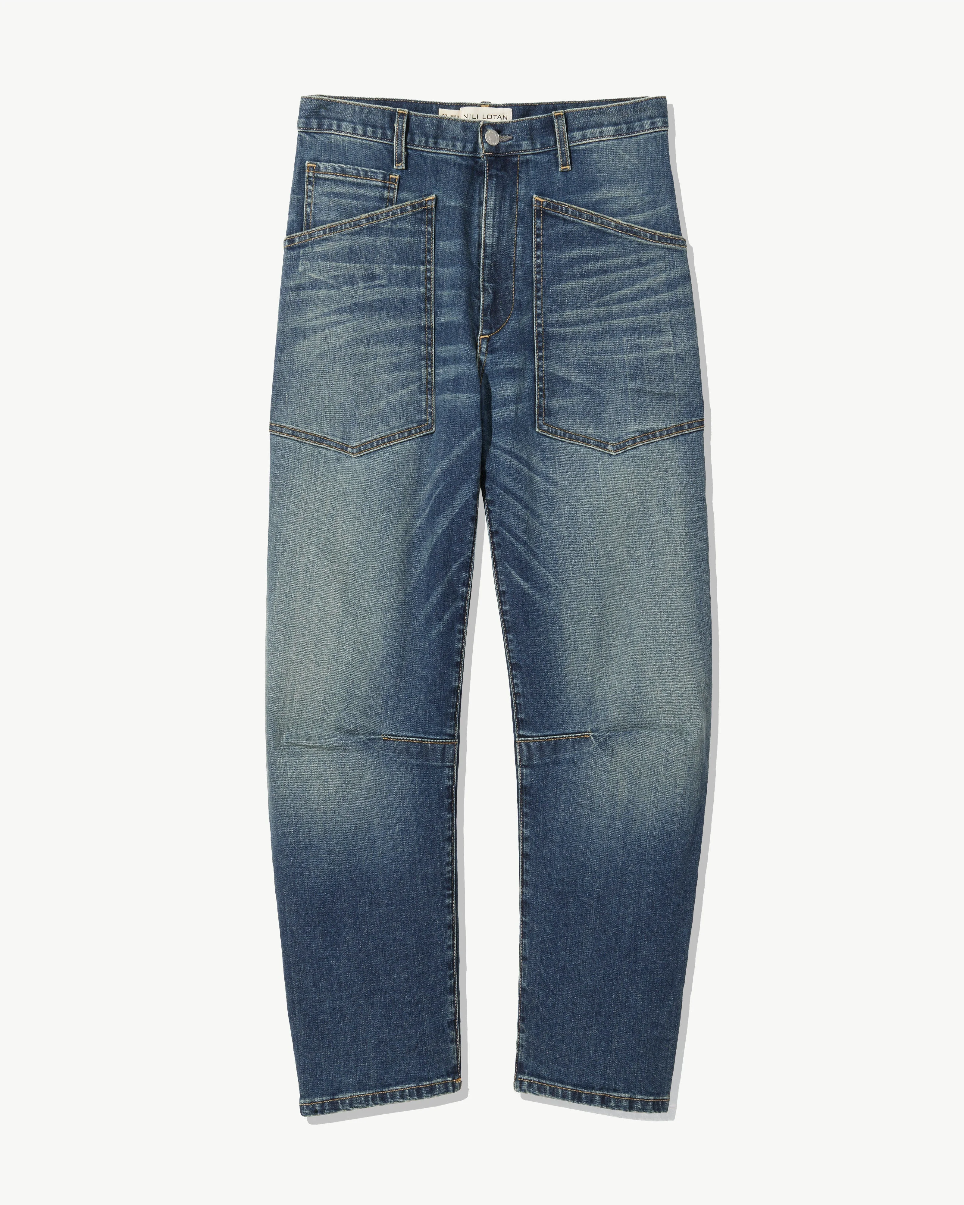 Mid-rise relaxed-fit jean in stretch denim. Uniquely curved silhouette. Easy, gently tapered legs. Seam detail at knees. Zip fly and button-front closure. Top-stitched front and back patch pockets. Fabric is premium Japanese denim and is made in Los Angeles. Made in USA SIZE & FIT Model is 5'11 with 32.5" bust, 26" waist, and 36" low hip. Model is wearing a size 26. Fits like the Shon Pant. For exact measurements by size, view our size guide. COMPOSITION & CARE 98% COTTON 2% POLYURETHANE, MADE IN USA OF IMPORTED FABRIC MACHINE WASH COLD DO NOT BLEACH TUMBLE DRY LOW LOW IRON DRY CLEAN