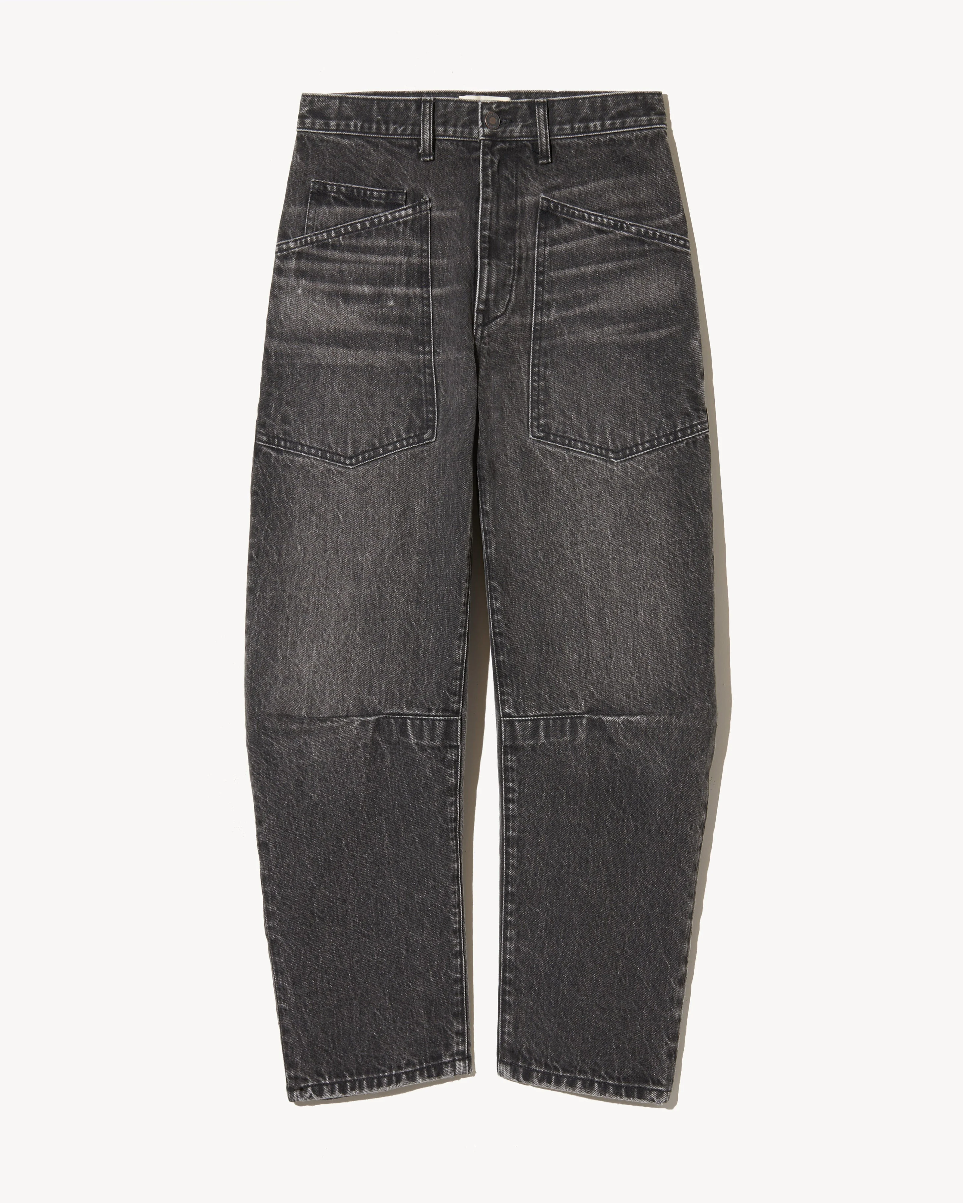 Mid-rise, relaxed fit barrel leg jean. Uniquely curved silhouette. Seam detail at knees. Gusset at inseam. Zip fly. Shank closure. Top-stitched front and back patch pockets. Belt loops. - Made in USA - 100% Cotton - Machine wash cold - Tumble dry low - Low iron