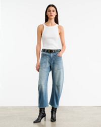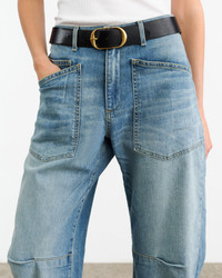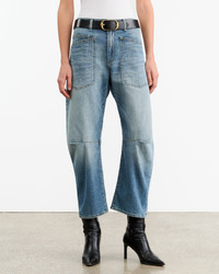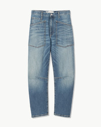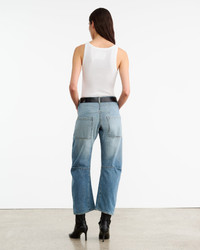 Mid-rise, relaxed fit jean in Japanese stretch denim. Uniquely curved silhouette. Seam detail at knees. Gusset at inseam. Zip fly. Shank closure. Top-stitched front and back patch pockets. Belt loops. Made in USA COMPOSITION & CARE 98% COTTON 2% POLYURETHANE, MADE IN USA OF IMPORTED FABRIC MACHINE WASH COLD DO NOT BLEACH TUMBLE DRY LOW LOW IRON DRY CLEAN
