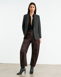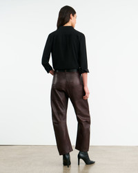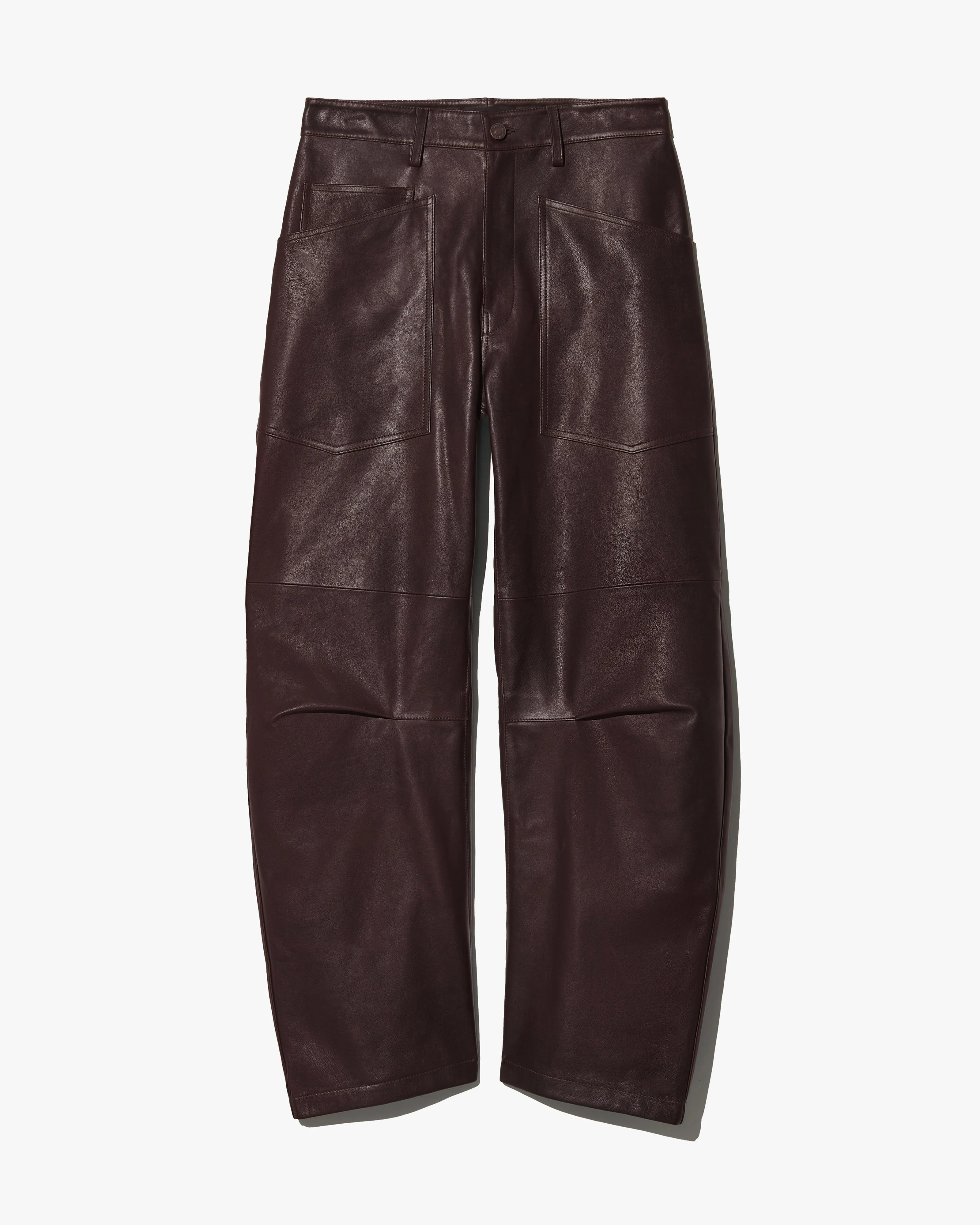 Mid-rise, relaxed fit pant in Italian lambskin leather. Uniquely curved silhouette. Seam detail at knees. Gusset at inseam. Zip fly. Shank closure. Top-stitched front and back patch pockets. Belt loops. Fully lined. Designed for a 26.3" inseam. COMPOSITION & CARE 100% Lambskin Leather Professional leather care only Spot clean only