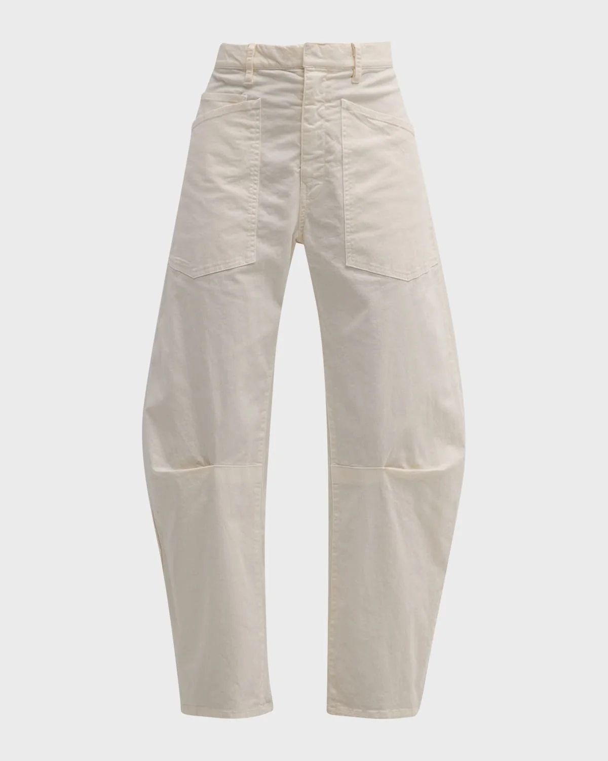 - Nili Lotan "Shon" stretch twill pants. - Mid rise. - Front patch pockets; dropped back pockets. - Curved silhouette. - Cropped length. - Hook-and-bar/zip fly; belt loops. - Cotton/spandex. - Made in USA.