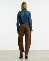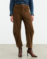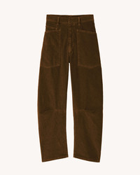 Flat front, mid-rise, relaxed fit pant in stretch corduroy. Uniquely curved silhouette. Easy gently tapered legs. Seam detail at knees. Zip fly with hidden hook and bar closure. Hidden button closure. Top-stitched front and back patch pockets. Belt loops. Made in USA COMPOSITION & CARE 93% COTTON, 6% POLYESTER, 1% POLYURETHANE DO NOT BLEACH MACHINE WASH COLD TUMBLE DRY LOW LOW IRON DO NOT DRY CLEAN