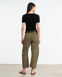 Mid-rise, relaxed fit barrel leg pant. Uniquely curved silhouette. Seam detail at knees. Gusset at inseam. Zip fly. Hidden hook-and-bar closure. Hidden stay button closure. Top-stitched front and back patch pockets. Belt loops. Designed for a 26.2" inseam. - 77% Cotton, 23% Linen - Do not bleach - Do not tumble dry - Low iron - Dry clean