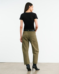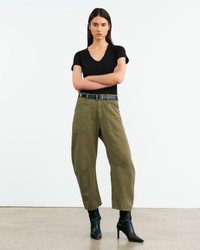 Mid-rise, relaxed fit barrel leg pant. Uniquely curved silhouette. Seam detail at knees. Gusset at inseam. Zip fly. Hidden hook-and-bar closure. Hidden stay button closure. Top-stitched front and back patch pockets. Belt loops. Designed for a 26.2" inseam—tailor for a personalized fit. COMPOSITION & CARE 77% Cotton, 23% Linen Do not bleach Do not tumble dry Low iron Dry clean