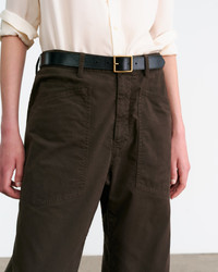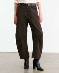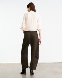 Mid-rise, relaxed fit barrel leg pant. Uniquely curved silhouette. Seam detail at knees. Gusset at inseam. Zip fly. Hidden hook-and-bar closure. Hidden stay button closure. Top-stitched front and back patch pockets. Belt loops. Designed for a 26.5" inseam. - Made in USA - 98% Cotton, 2% Elastane - Machine wash cold - Low iron - Dry clean recommended