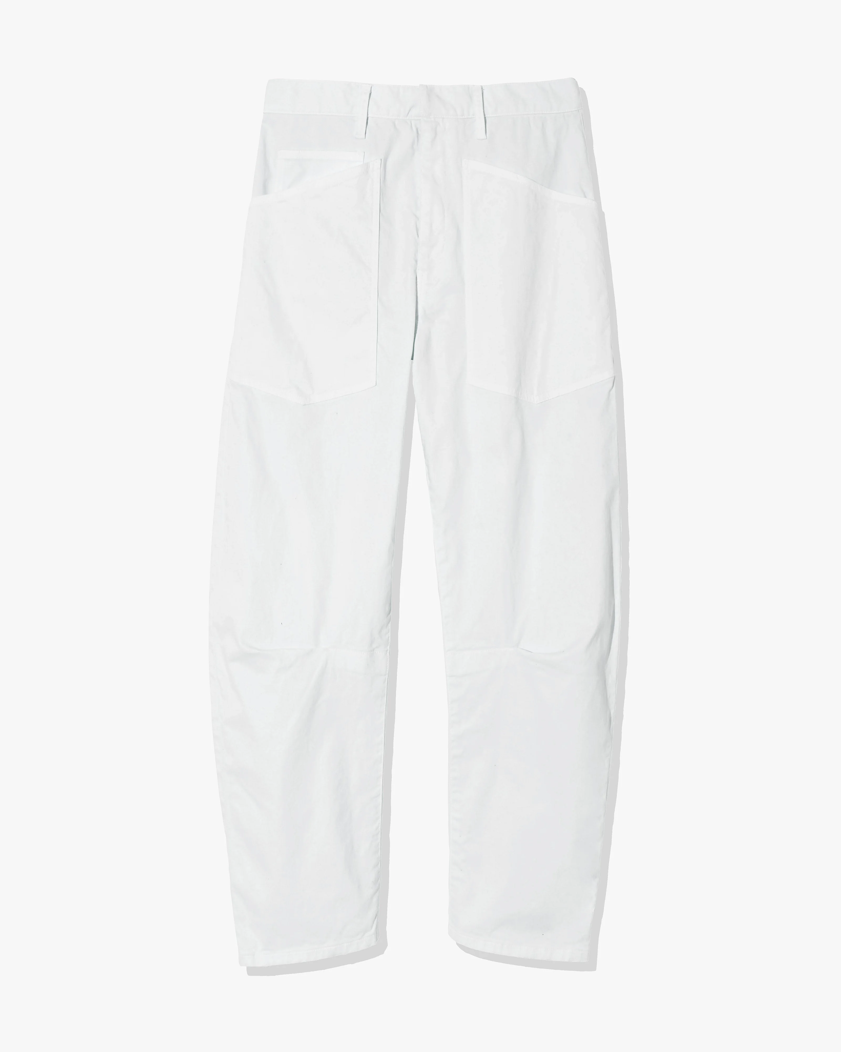 Mid-rise, relaxed fit barrel leg pant in brushed stretch twill cotton. Uniquely curved silhouette. Seam detail at knees. Gusset at inseam. Zip fly. Hidden hook-and-bar closure. Hidden stay button closure. Top-stitched front and back patch pockets. Belt loops. Designed for a 26.25" inseam. Made in USA COMPOSITION & CARE 98% Cotton, 2% Elastane Machine wash cold Low iron Dry clean recommended