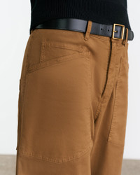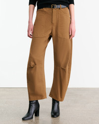 Mid-rise, relaxed fit barrel leg pant. Uniquely curved silhouette. Seam detail at knees. Gusset at inseam. Zip fly. Hidden hook-and-bar closure. Hidden stay button closure. Top-stitched front and back patch pockets. Belt loops. Designed for a 26.5" inseam. - Made in USA - 98% Cotton, 2% Elastane - Machine wash cold - Low iron - Dry clean recommended