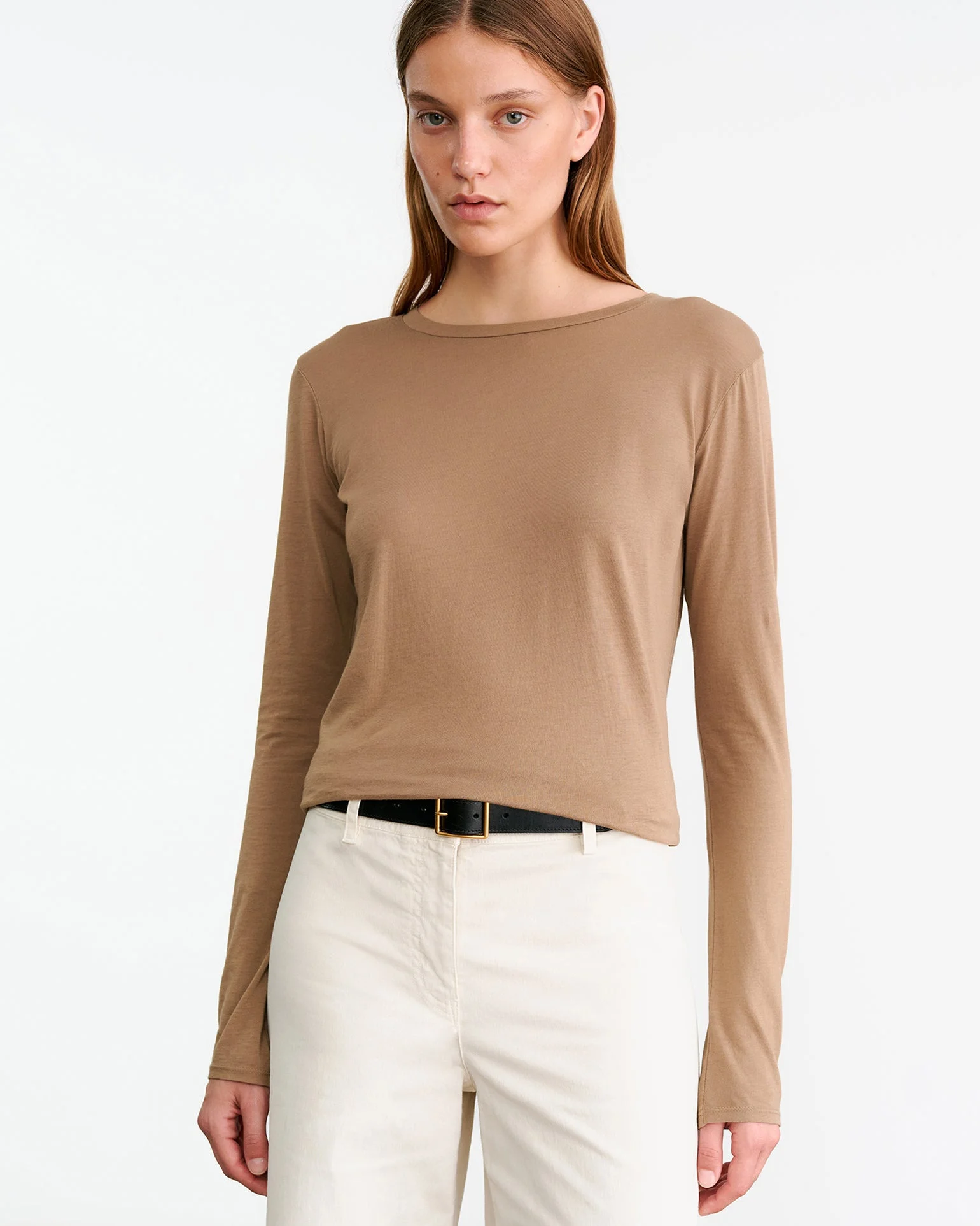 Slim long sleeve crewneck tee. Set in sleeve. - Made in USA - 100% Cotton - Machine wash cold - Do not bleach - Tumble dry low - Low iron