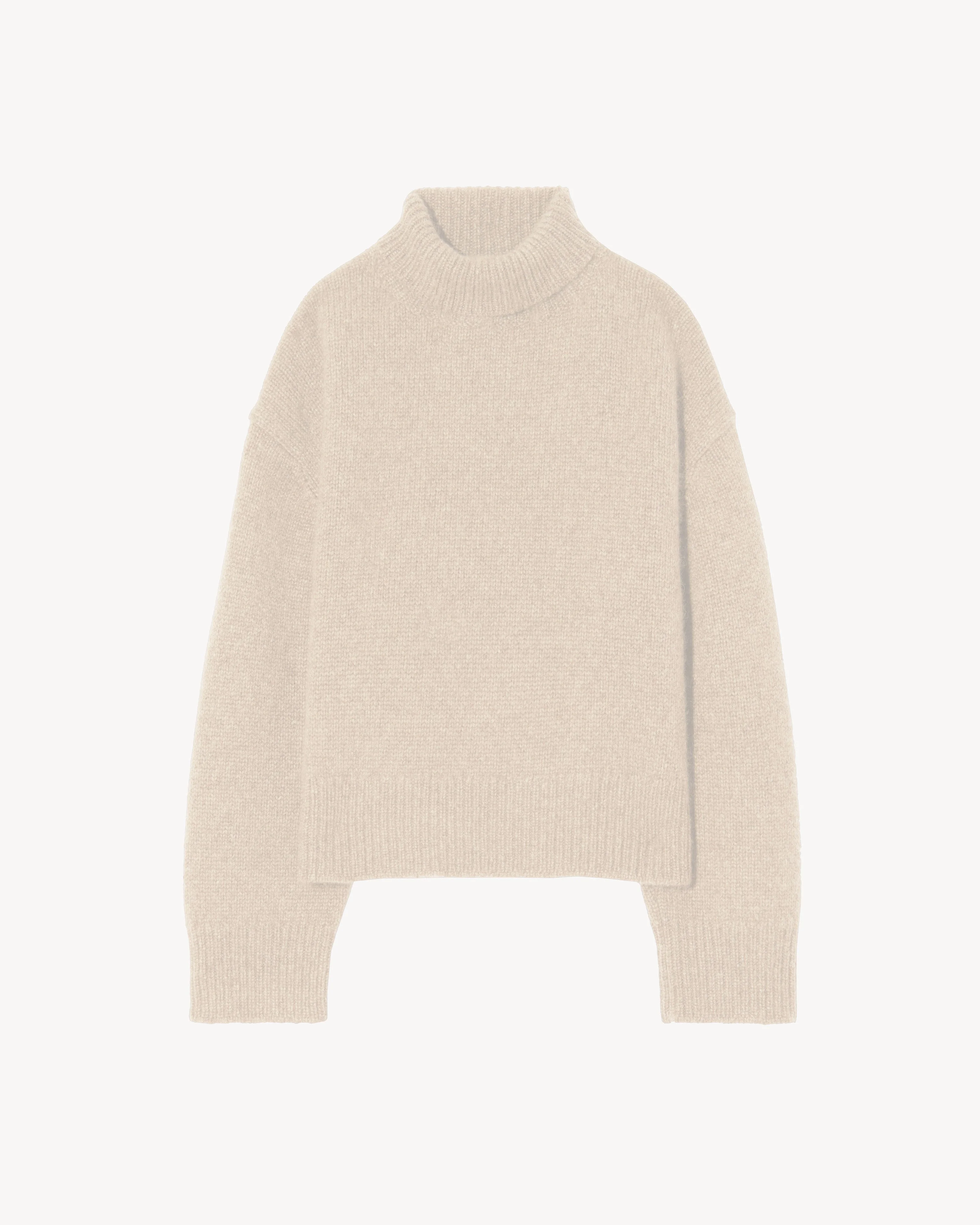 Chunky weight boxy turtleneck. High neck designed to be worn up, but easily able to fold over. Dropped shoulder. Rib start at hem and sleeve. Fashioning along arm hole. Signature center back cable knit detail. - 90% Cashmere 10% Silk - Dry clean recommended