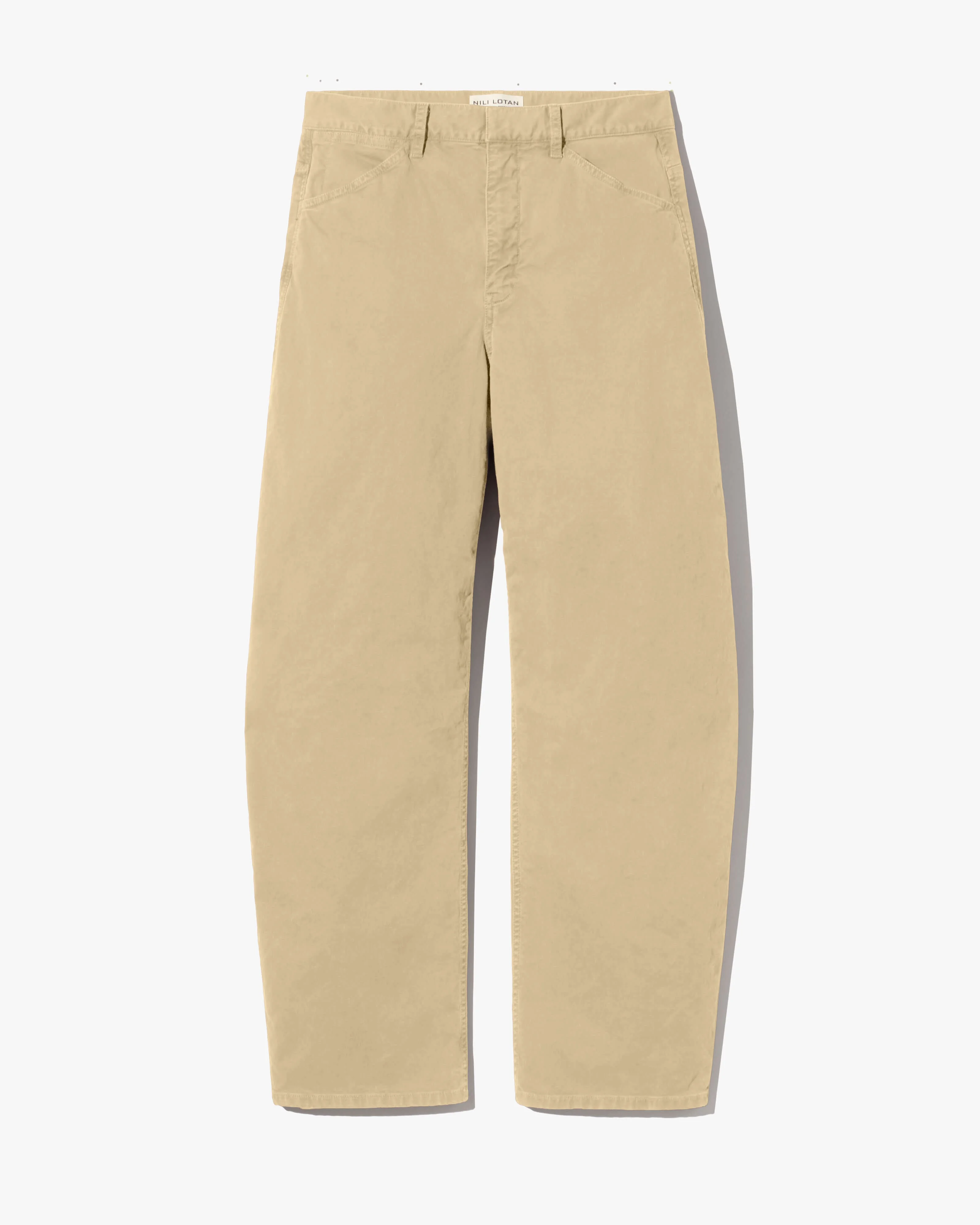 Mid-rise relaxed barrel leg pant in Italian brushed stretch twill cotton. Slant pockets. Back patch pockets. Coin pocket. Hidden hook-and-bar closure. Zip fly. Belt loops.
