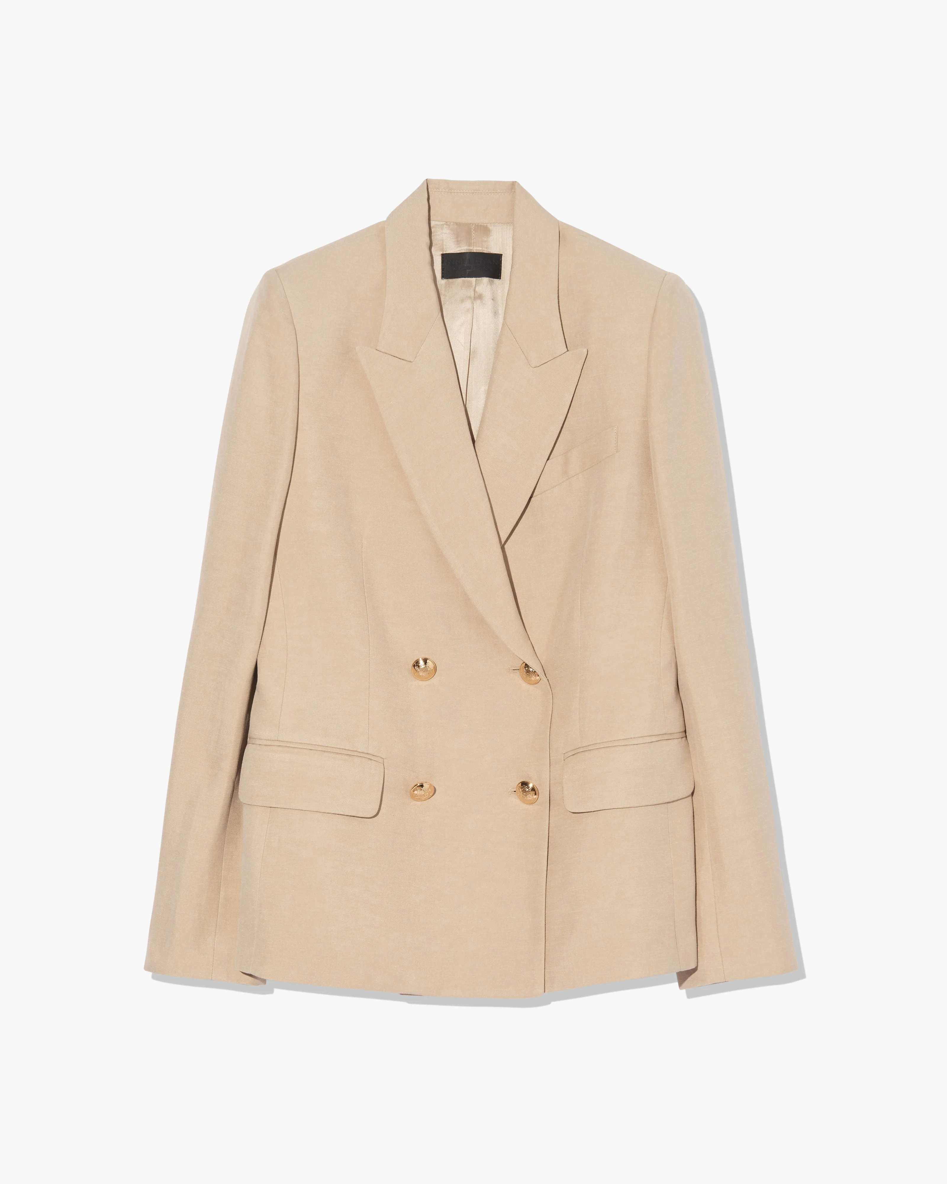 Classic, straight fit double breasted jacket. Signature crest buttons in antique gold brass. Chest pocket. Single interior chest pocket. Soft constructed shoulder pads. Fitted shoulder. Standard sleeve length. Back vent. Fully lined. Made in USA COMPOSITION & CARE 59% Linen, 41% Silk Dry clean only Low iron