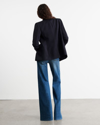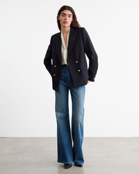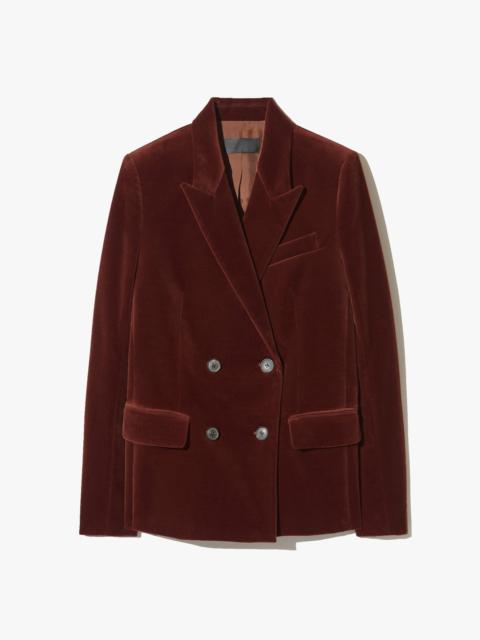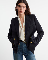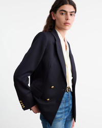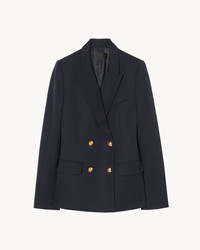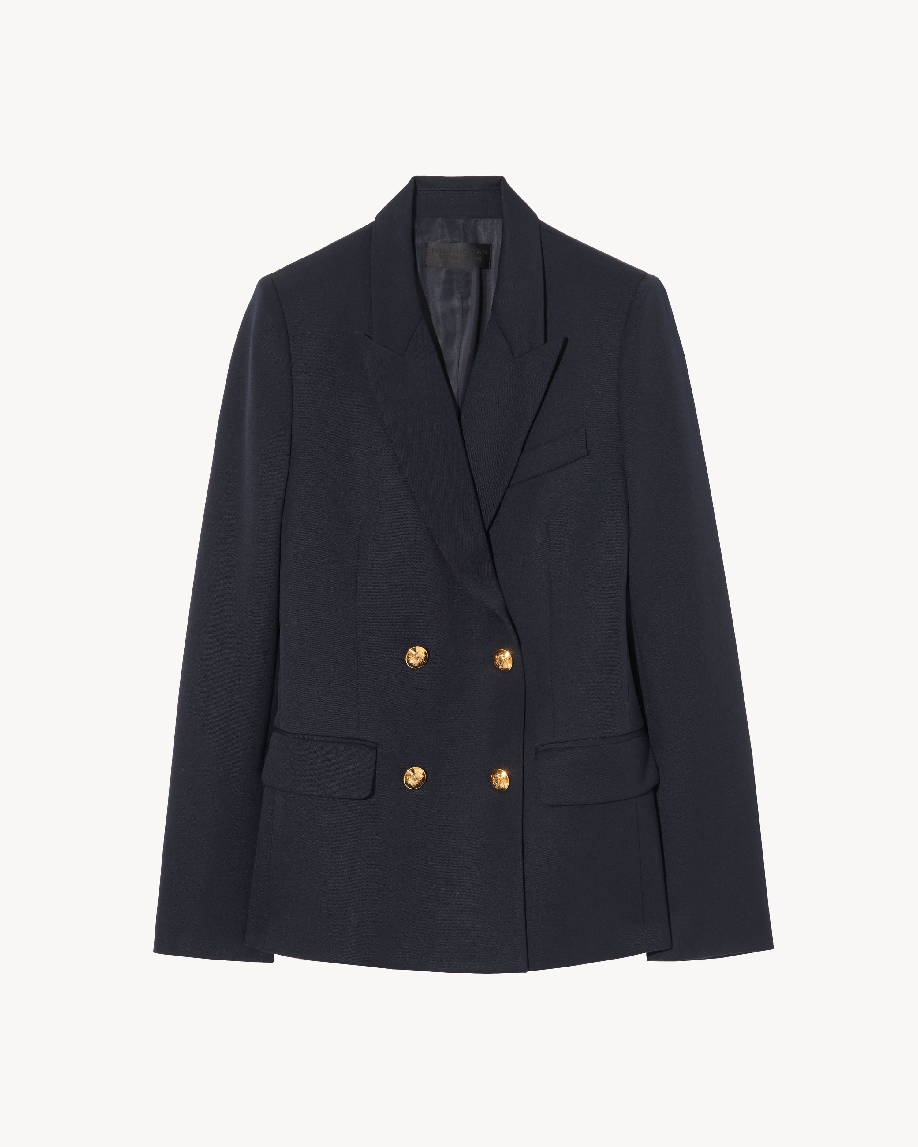 Classic, straight fit double breasted jacket in wool. Signature crest buttons in gold. Chest pocket. Single interior chest pocket. Soft constructed shoulder pads. Fitted shoulder. Standard sleeve length. Back vent. Fully lined. Made in USA COMPOSITION & CARE 100% VIRGIN WOOL DRY CLEAN ONLY
