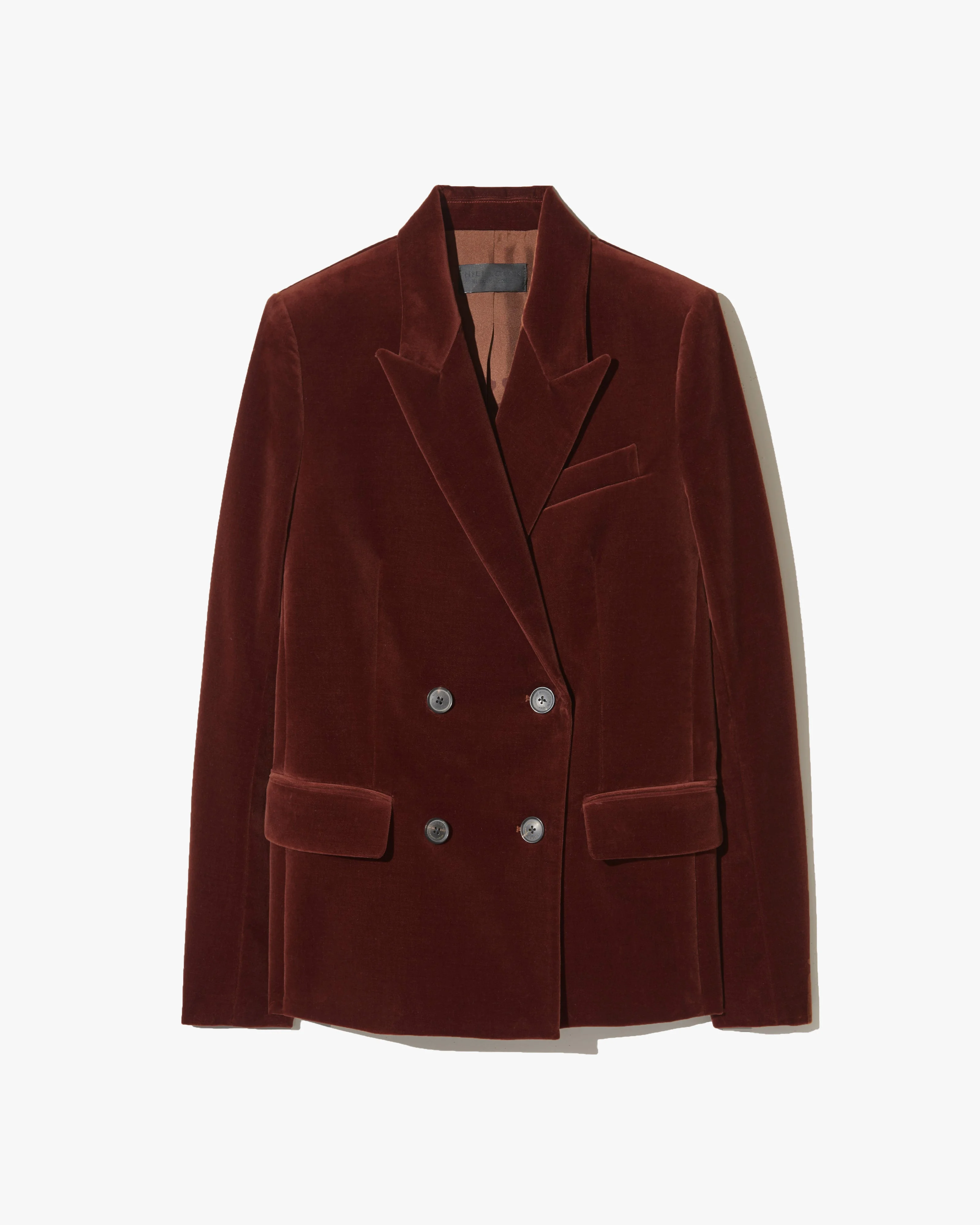 Classic, straight fit double breasted jacket. Signature crest buttons in antique gold brass. Chest pocket. Single interior chest pocket. Soft constructed shoulder pads. Fitted shoulder. Standard sleeve length. Back vent. Fully lined. - 98% Cotton 2% Elastane - Dry clean only - Do not bleach - Low iron
