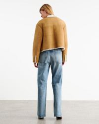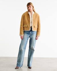 Boxy, cropped shearling jacket in lamb fur. Suede finish. Natural finish on interior. Leather trim detail at body, neck, sleeve and hem. Dropped shoulder. Signature crest buttons in gold. Flap pockets. COMPOSITION & CARE 100% GENUINE LAMB FUR SPOT CLEAN ONLY