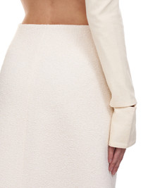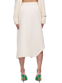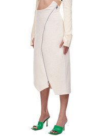 Nina Ricci skirt in cream, front zip closure, asymmetric silhouette, midi length, silver-tone hardware, lined. Made In Portugal. Composition: 65% Cotton, 30% Polyester, 5% Other Fibers. French Sizing Model Measurements: Model is 5ft 8” and wearing a size 36. Bust: 32” Waist: 24” Hip: 34"