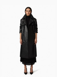 A wardrobe classic and a staple of the Nina Ricci collections, the trench coat is reimagined this season in crinkled black leather, tied at the waist with a matching belt for a refined, structured silhouette. COMPOSITION & DETAILS - 100% goat leather. - Regular fit. - Shoulder tabs. - Belted cuffs. - Back vent. - Double-breasted with 6-button closure. - Model is 180 cm/ 5ft 11in and wears a size 38 (FR). - Ref : 25AUMA017LB0074U9000