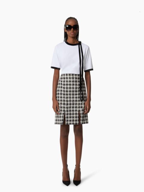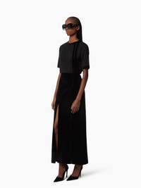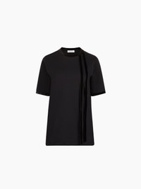This black short-sleeved t-shirt is crafted from stretch cotton jersey for maximum comfort. A black velvet ribbon delicately traces the neckline—a signature detail of Maison Nina Ricci—while textured finishes at the sleeves bring a subtle yet sophisticated touch. COMPOSITION & DETAILS - 100% cotton. - Straight cut. - Crew neckline. - Velvet ribbon detail at the collar. - Textured finishes at sleeves and collar. - Model is 180 cm/ 5ft 11in and wears a size S. - Ref: 25AJTO035CO1108U9000
