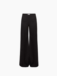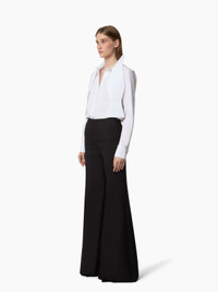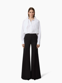 These flared trousers in black wool gabardine stand out with their fluid drape and effortless elegance. Fitted at the waist, they gradually flare out to the hem, creating a long, versatile silhouette. Whether styled with sophistication or ease, they channel a confident and modern attitude. A key piece in the Fall-Winter 2025 collection, true to Maison Nina Ricci’s couture legacy. COMPOSITION & DETAILS - 100% virgin wool. - Wide-leg fit. - No waistband. - Side zip closure. - Model is 178 cm/ 5ft 10in and wears a size 36 (FR). - Ref: 25ACPA020WV0324U9000