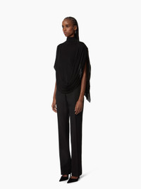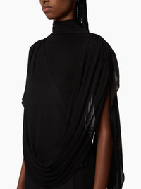 Crafted in fluid stretch jersey, this black high-neck top is designed to enhance movement and silhouette with a sleek, sculptural look. Defined by soft, asymmetrically placed draping, it gently contours the bust. A comfortable piece with a refined, structured elegance. COMPOSITION & DETAILS - 94% viscose, 6% elastane. - Fitted cut. - High neckline. - Draped front and back. - Model is 178 cm/ 5’10” and wears a size 36 (FR). - Ref: 25AJTO016VI0539U9000