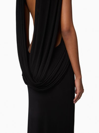 Cut from fluid stretch jersey, this sleeveless dress offers a refined, body-conscious silhouette. The high neckline contrasts with a low-cut back, framed by elegant draping that highlights its sculptural lines. A timeless design updated with a modern sense of movement. COMPOSITION & DETAILS - 94% viscose, 6% elastane. - Fitted cut. - Plunging open back. - High neckline. - Double-draped back. - Model is 180 cm/ 5’11” and wears a size 34 (FR). - Ref: 25AJRO014VI0539U9000