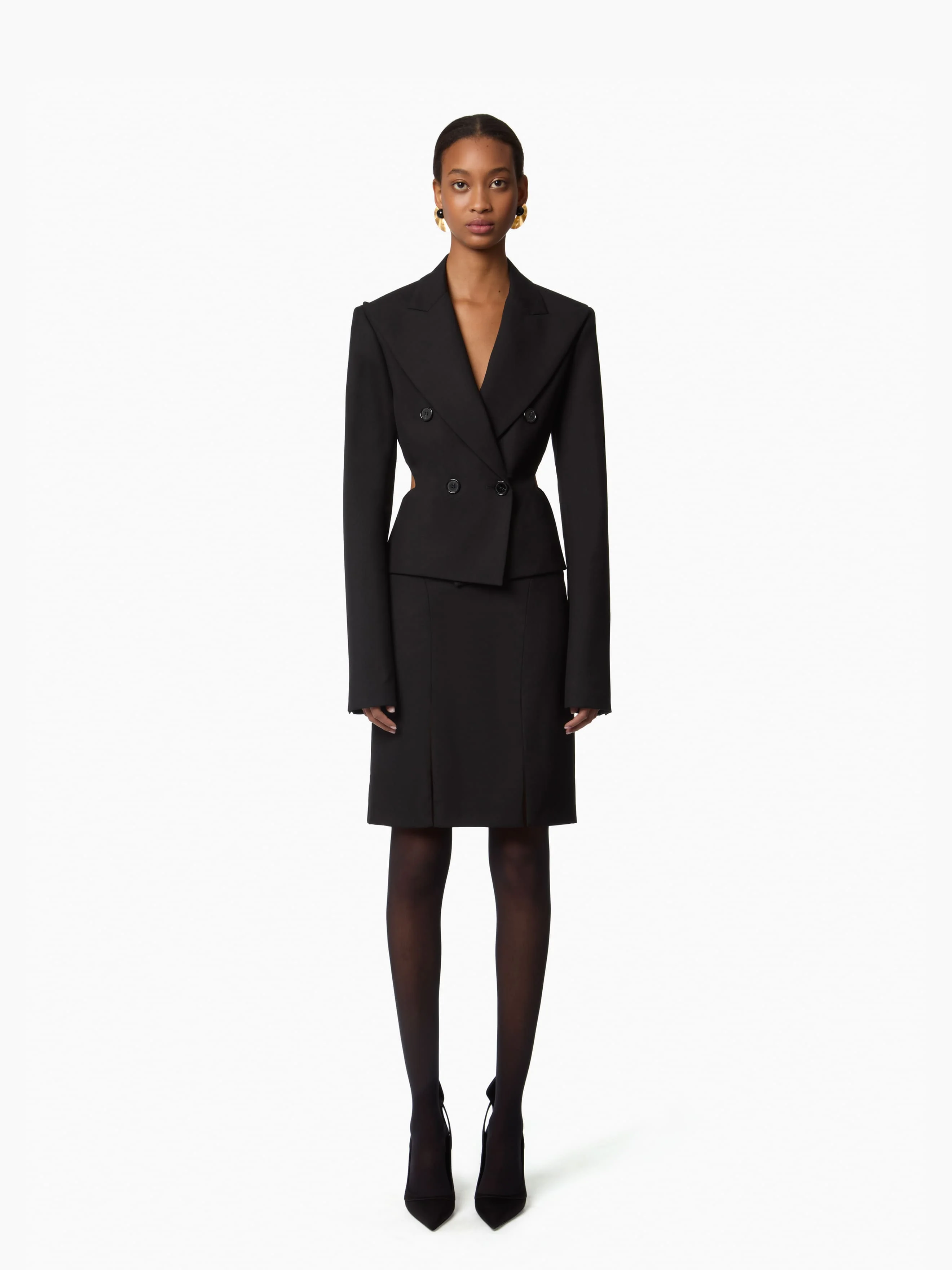 Designed by Harris Reed for the Fall-Winter 2025 collection, this open-back jacket redefines tailoring with bold lines and a unique silhouette. Crafted in black wool gabardine, it features a sharp wide-point collar, precise double-breasted closure, and an openwork panel at the back—merging structured elegance with a modern edge. COMPOSITION & DETAILS - 100% Virgin wool. - Fitted at the waist. - Wide pointed collar. - Openwork panel across the back. - Five-button cuffs. - Double-breasted front closure. - Model is 180 cm/ 5ft 11in and wears a size 36 (FR). - Ref: 25ACVE005WV0324U9000