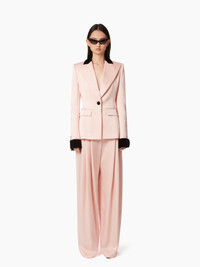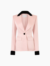 Emblematic of the Nina Ricci silhouette, the suit symbolizes timeless elegance. Harris Reed adapts and reinterprets it each season in a variety of styles. Crafted in blush pink satin-backed crepe, this single-breasted blazer features contrasting velvet braiding on the collar and bottom sleeves. Paired with tailored pants from the collection, it will stand out for a total Nina Ricci look. COMPOSITION & DETAILS - 74% acetate, 26% viscose. - Collar, sleeve and buttonhole details in contrasting velvet. - Single contrast button closure. - Flap pockets on hips. - Model is 182 cm and wears a size 36 (FR). - Ref : 25PCVE004AC0123U2785