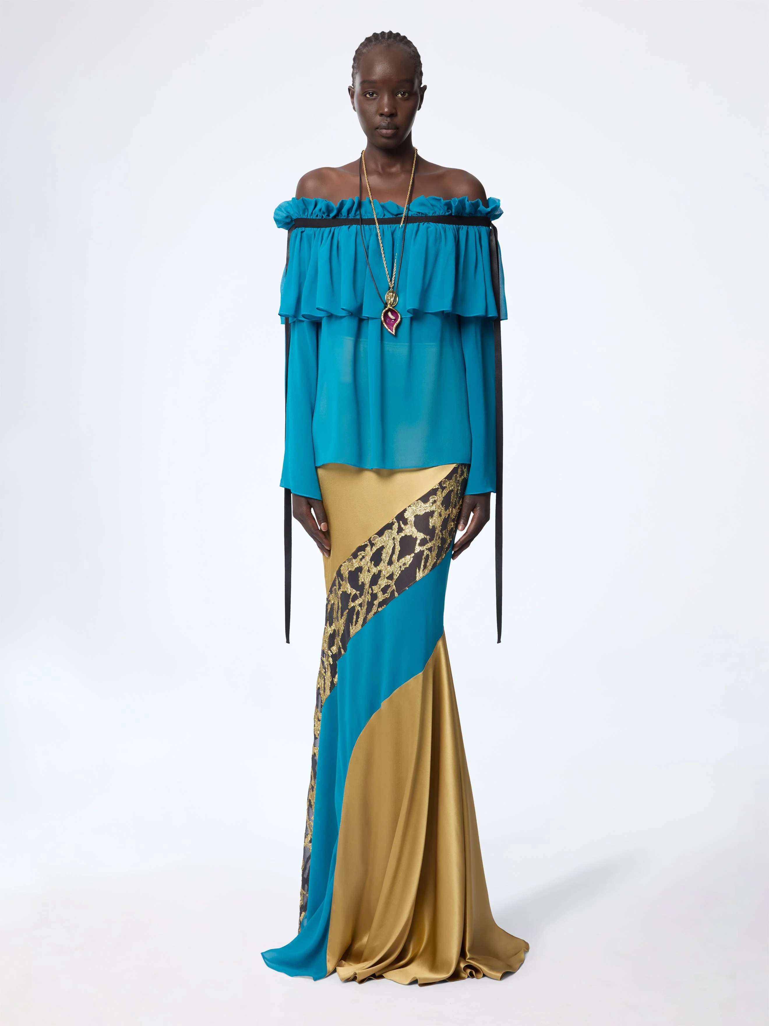 New for the Spring-Summer 2026 collection, this blue silk top with boat neck features a bow detail for an elegant and sophisticated look. COMPOSITION & DETAILS - 100% silk. - Loose fit. - Off-the-shoulder. - Side bow details. - Model is 180 cm/ 5ft 11in and wears size 38 (FR). - Ref: 26PCTO023SE1417U4466