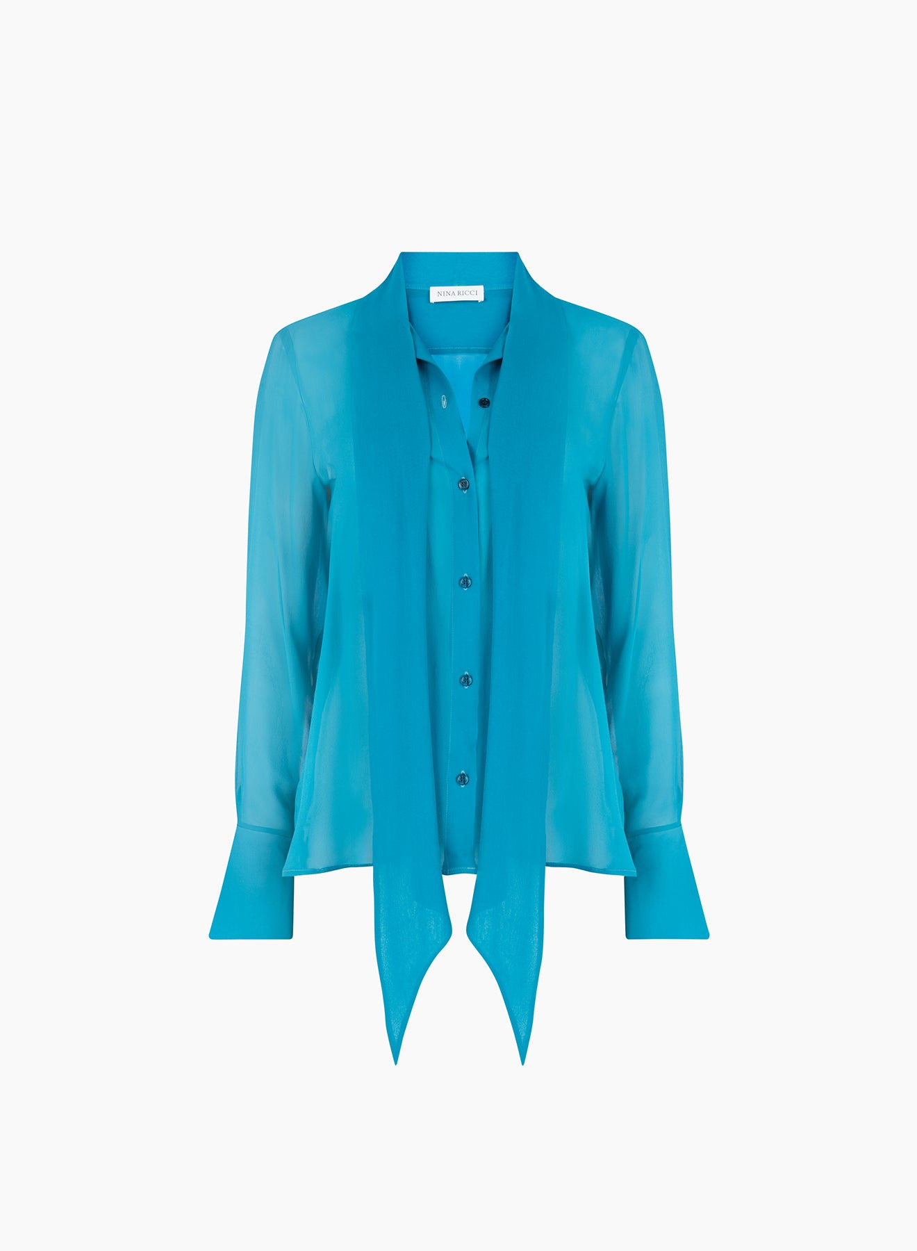 A signature of the Nina Ricci silhouette, the lavalliere shirt embodies timeless elegance, reimagined each season by Harris Reed. In this vibrant blue satin version, it exudes a bold, sensual allure. Its luminous fluidity and structured cut bring radiance and sophistication to the silhouette — a standout piece from the Spring-Summer 2026 collection, blending couture tradition with modern expression. COMPOSITION & DETAILS - 100% silk. - Lavalliere collar. - Bell cuffs. - Model is 180 cm/ 5ft 11in and wears size 36 (FR). - Ref: 26PCTO001SE1417U4466