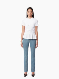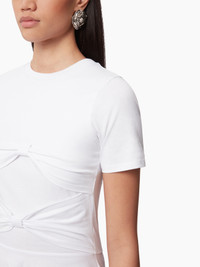 New to the Fall-Winter 2024 collection, this top with bow inlays and a pleated basque recalls the Maison's codes and symbolizes the Nina Ricci woman in a modern interpretation. This style fits true to size. Take your regular size. COMPOSITION & DETAILS - 100% cotton. - Slim fit. - Round collar. - Short sleeves. - Inlaid bow detail on front. - Model is 178 cm and wears a size S (FR). - Ref : 24AJTO029CO1075U1000