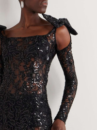EDITORS'NOTES Nina Ricci's gown is the kind you'll want to wear to glamorous evening soirees. Cut from lace covered with glittering sequins, its embellished with sweet bows and has cutouts at the shoulders to create the illusion of detached sleeves. Underpin yours with tonal lingerie for coverage. SIZE & FIT - Fits true to size, however those who are between sizes should take the smaller size - Designed for a slim fit - Mid-weight, embellished, non-stretchy fabric - Model is 177cm/ 5'10" and is wearing a FR 34 DETAILS & CARE - Black sequined lace - Slips on - 80% polyamide, 20% polyethylene - Machine wash