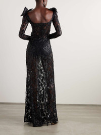 Bow-embellished cutout sequined lace gown