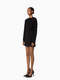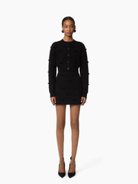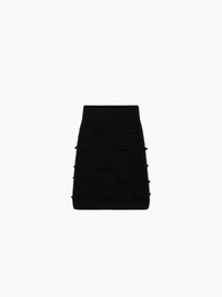 This black mini skirt in mohair knit blends softness and warmth. Made from a double-faced knit, it pairs a mohair outer layer with a wool interior for optimal comfort. Tone-on-tone bows are delicately hand-applied across the piece, adding texture and structure. The ribbed elastic waistband gives a sporty edge while shaping the silhouette. Styled with the matching sweater, it completes a full Nina Ricci look. COMPOSITION & DETAILS - 86% wool, 7% mohair, 6% polyamide, 1% elastane. - Fitted cut. - Mini length. - Ribbed edges at waist and hem. - Hand stitched bows. - Model is 180 cm/ 5ft 11in and wears a size S. - Ref: 25AMJU004ML0585U9000