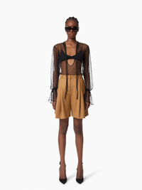 These wide pleated shorts in tobacco brown wool gabardine make a strong comeback in the Fall-Winter 2025 collection. Featuring a high-rise waist and a structured cut, they reinterpret classic tailoring codes with bold modernity—an essential piece in the Nina Ricci wardrobe. COMPOSITION & DETAILS - 100% virgin wool. - High waist. - Wide-leg fit. - Belt loops. - Concealed closure. - 2 slanted pockets. - Model is 180 cm/ 5ft 11in and wears a size 36 (FR). - Ref: 25ACPA010WV0324U7403