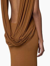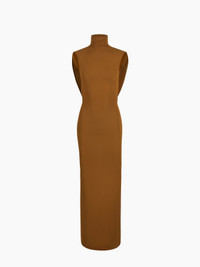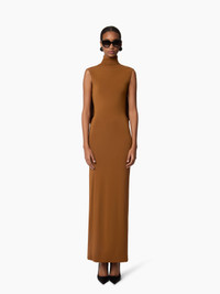 This sleeveless chocolate-hued jersey dress features a fluid, stretch construction, and a clean, sculpted silhouette. A high neckline contrasts with a dramatic low-cut back framed by elegant draping, while the play-on volume adds a contemporary twist to this timeless piece. COMPOSITION & DETAILS - 94% viscose, 6% elastane. - Fitted cut. - Plunging open back. - High neckline. - Double-draped back. - Model is 180 cm/ 5’11” and wears a size 34 (FR). - Ref: 25AJRO014VI0539U7518
