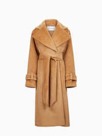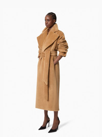 This long wrap coat in dark tobacco is crafted from a soft blend of brushed alpaca and virgin wool. Defined by clean lines and structured elegance, it features a wide collar and cuffed sleeves that highlight its couture spirit. Designed for a modern and feminine silhouette. COMPOSITION & DETAILS - 55% alpaca, 45% virgin wool. - Relaxed fit. - Back vent pleat. - Model is 180 cm/ 5ft 11in and wears a size 40 (FR). - Ref: 25ACMA001WO0360U7403