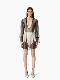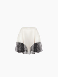 This cream stretch satin mini skirt stands out with its pointed hem and refined sheer detailing. The hemline is trimmed with a contrast polka-dot tulle panel, delicately pleated to bring lightness and movement to the silhouette. Combining sensuality with couture spirit, this Fall-Winter 2025 piece embodies the bold elegance of Maison Nina Ricci. COMPOSITION & DETAILS - 52% viscose, 37% silk, 11% elastane. - Flared silhouette. - Integrated shorty under the skirt. - Model is 178 cm/ 5ft 10in and wears a size 36 (FR). - Ref: 25ACJU012VI0530U1230