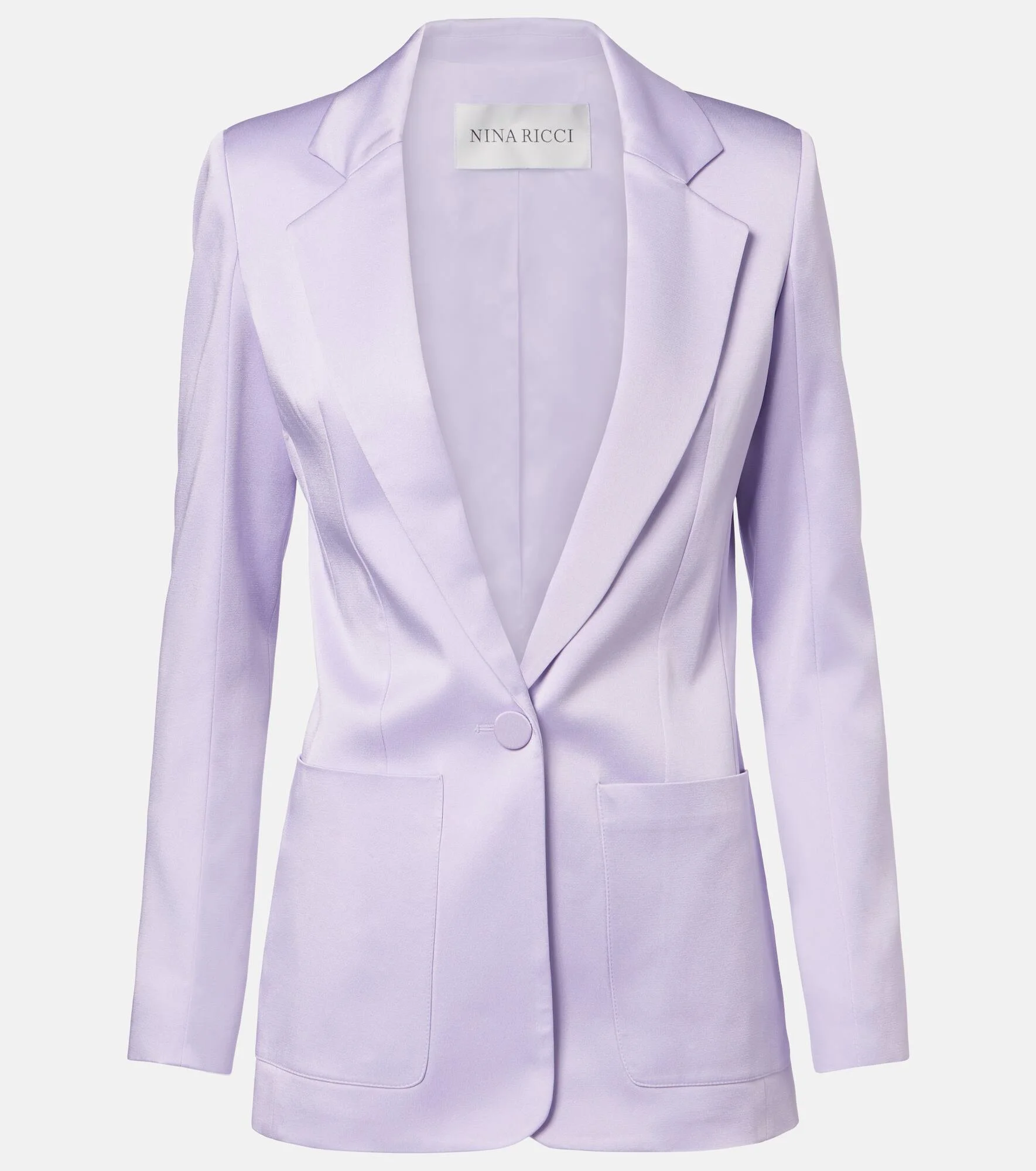 A skillful play of structure and proportion ensures the house of Nina Ricci remains a tastemaker for Parisian style. This single-breasted blazer is made from crepe satin. Product Details - Material: 74% acetate, 26% viscose - Care instructions: dry clean - Made in Romania - Color: purple - Designer color name: Lila Clair - Lining: 100% viscose - Notched lapel - Shoulder pads - Closure: single-breasted (one button) - Pockets: patch pockets - Cuff: buttoned - Item number: P01141616 Size & Fit - True to size - Shoulder pad inserts - Cinched waist - Non-stretchy fabric - Falls below the hip - The model seen in the picture is 178cm-5'10" and wearing a size FR 36